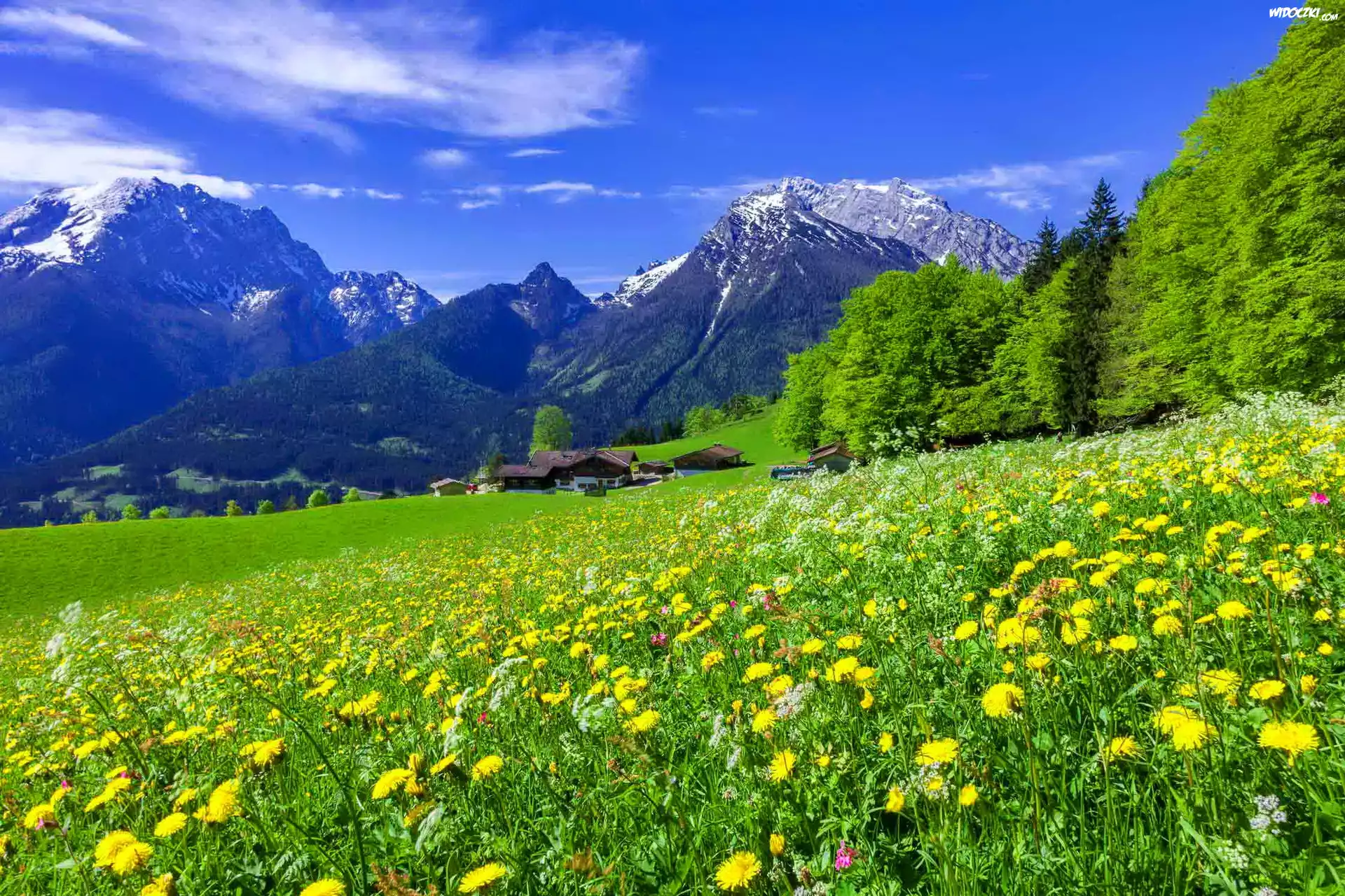 Zdjęcia, Łąka, Kwiaty, Góry, Lasy, Domy, Wiosna