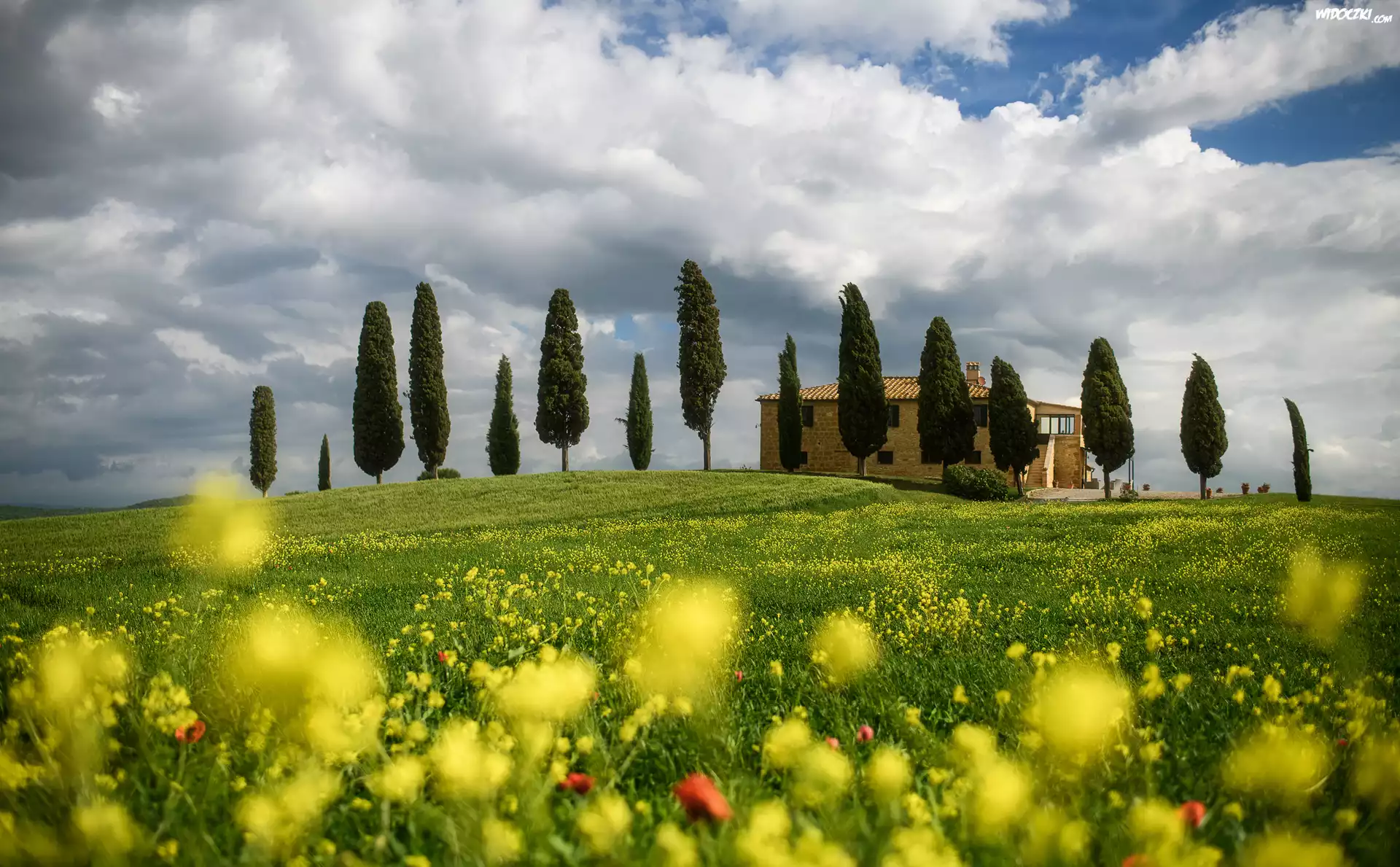 Zdjęcia, Łąka, Drzewa, Cyprysy, Dom, Toskania, Włochy