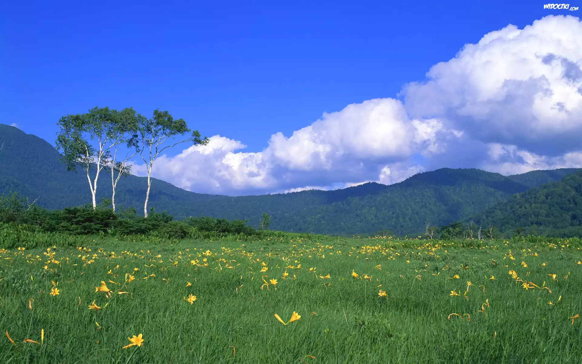 Łąka, Żółte, Lilie, Drzewa, Chmury, Wzgórza