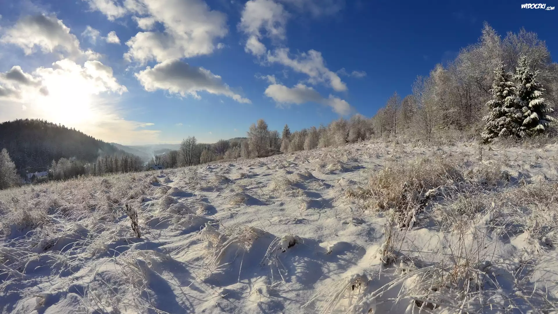 Zdjęcia, Łąka, Oszroniona, Trawa, Drzewa, Śnieg, Zima
