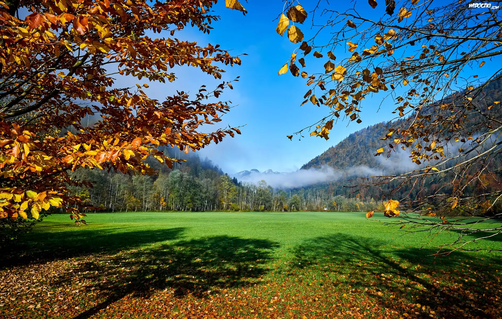 Łąka, Drzewa, Las, Góry, Mgła, Hagertal, Austria