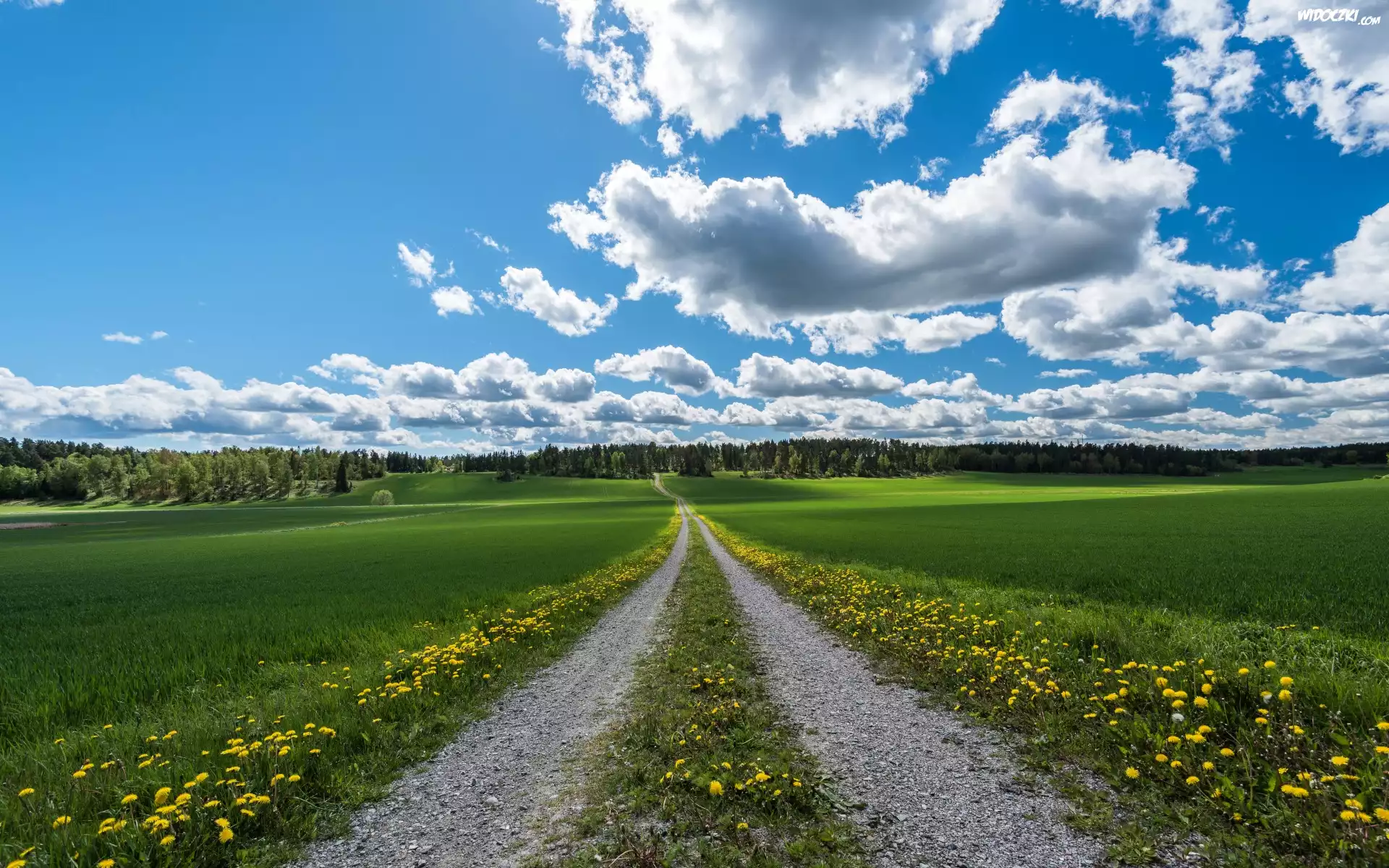 Zdjęcia, Droga, Łąka, Kwiaty, Mniszek pospolity, Chmury, Niebo