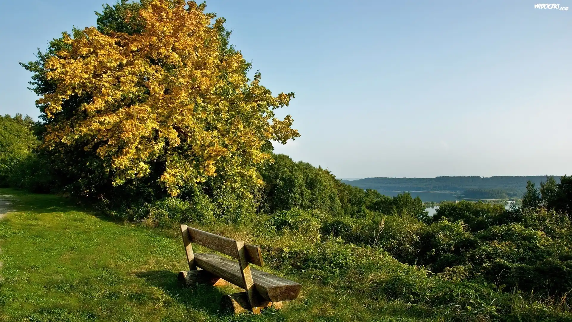 Zdjęcia, Ławeczka, Drzewa, Łąka, Lasy