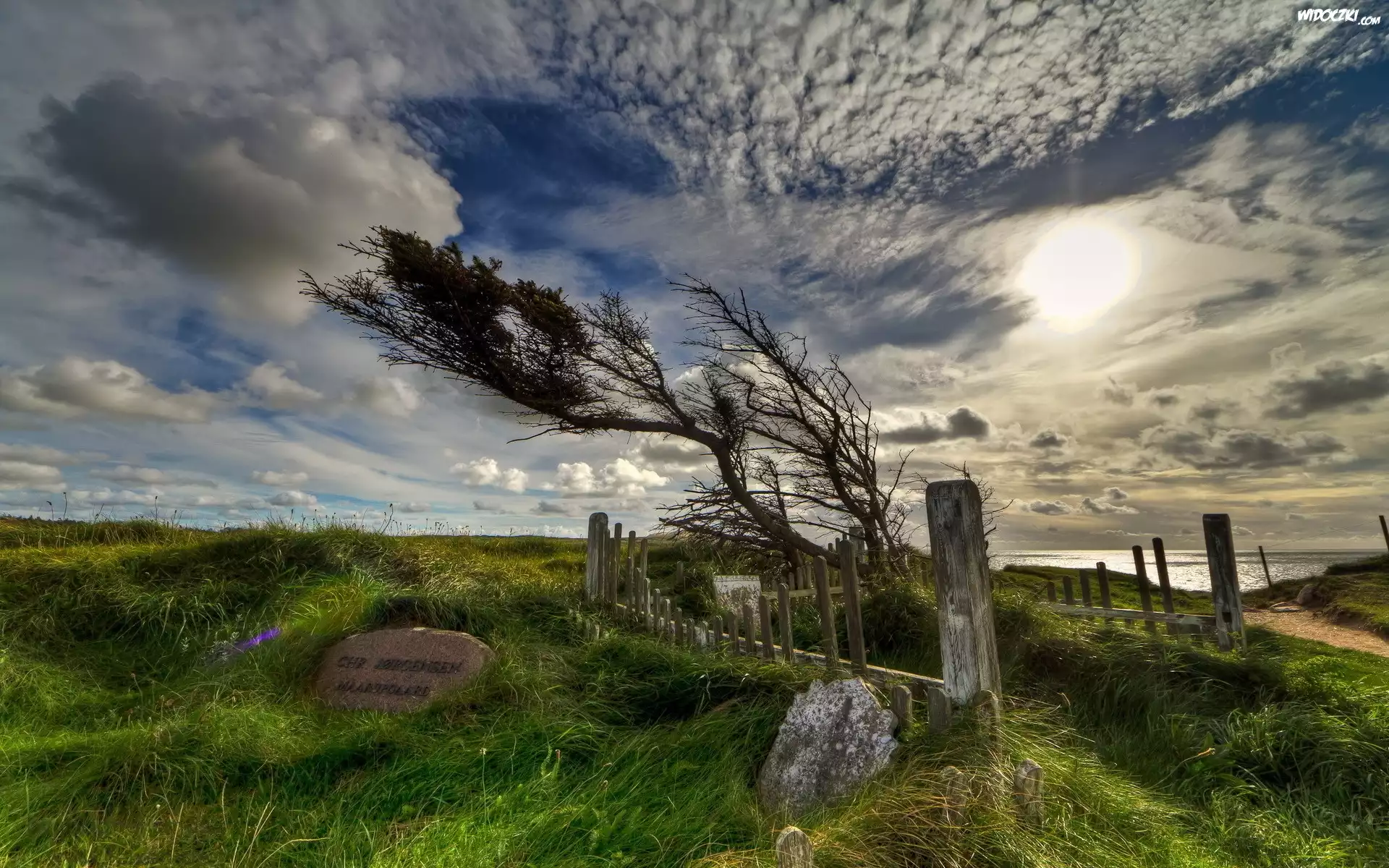 Zdjęcia, Niebo, Chmury, Drzewo, Wiatr, Pomnik, Ogrodzenie, Przebijające, Słońce, Łąka