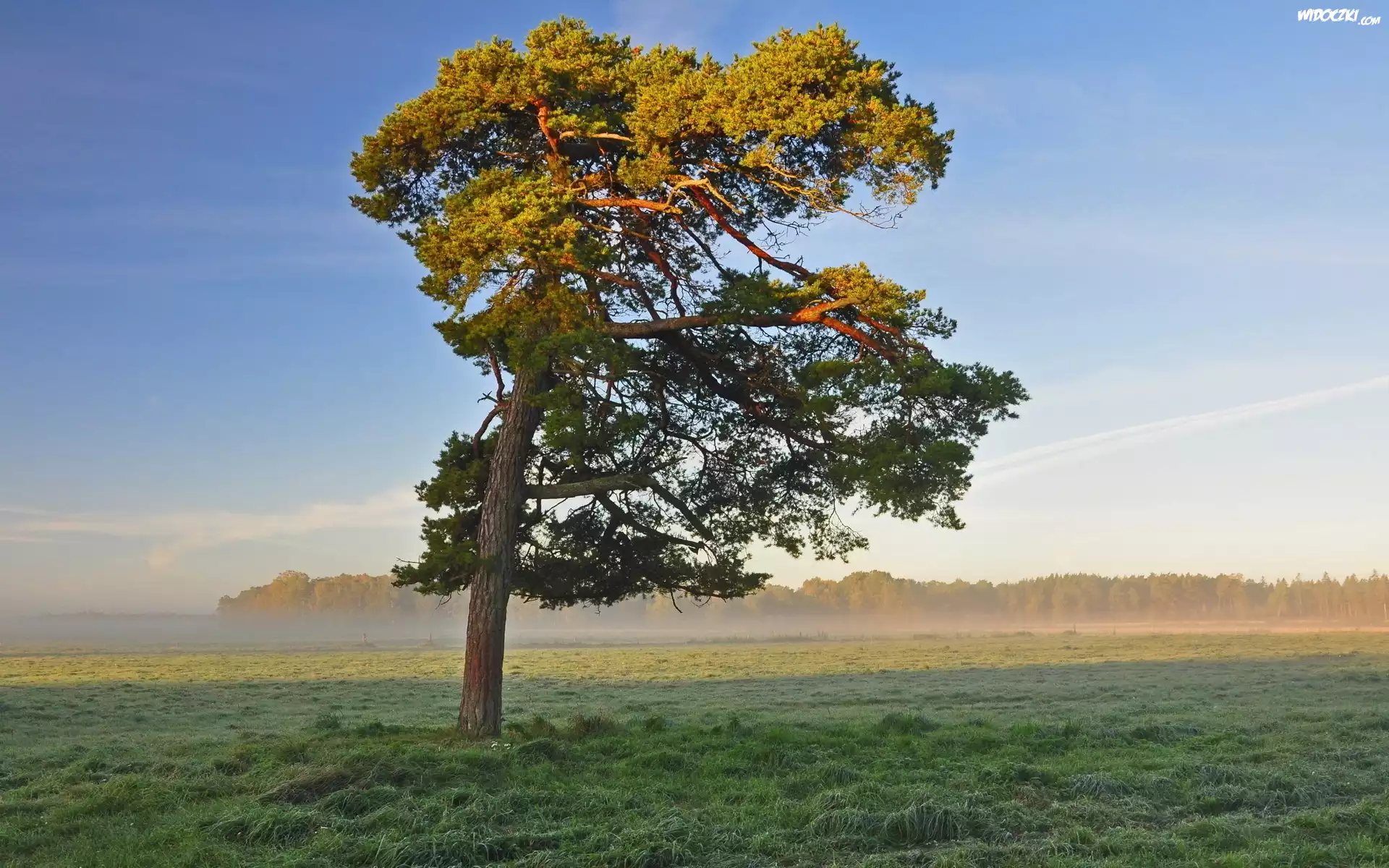 Zdjęcia, Drzewo, Łąka, Mgła