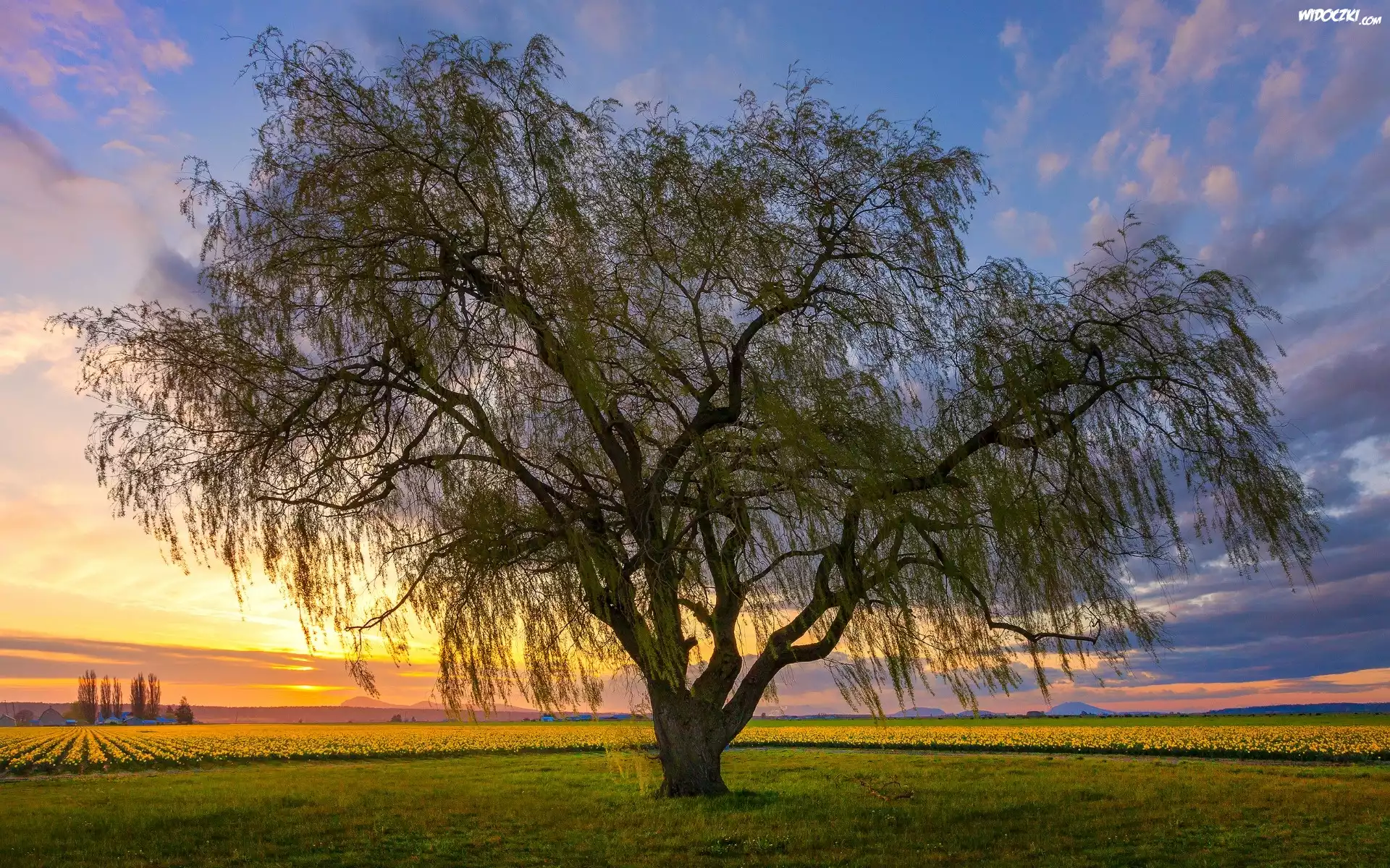 Zdjęcia, Drzewo, Łąka, Pola, Wschód, Słońca, Horyzont, Wiosna