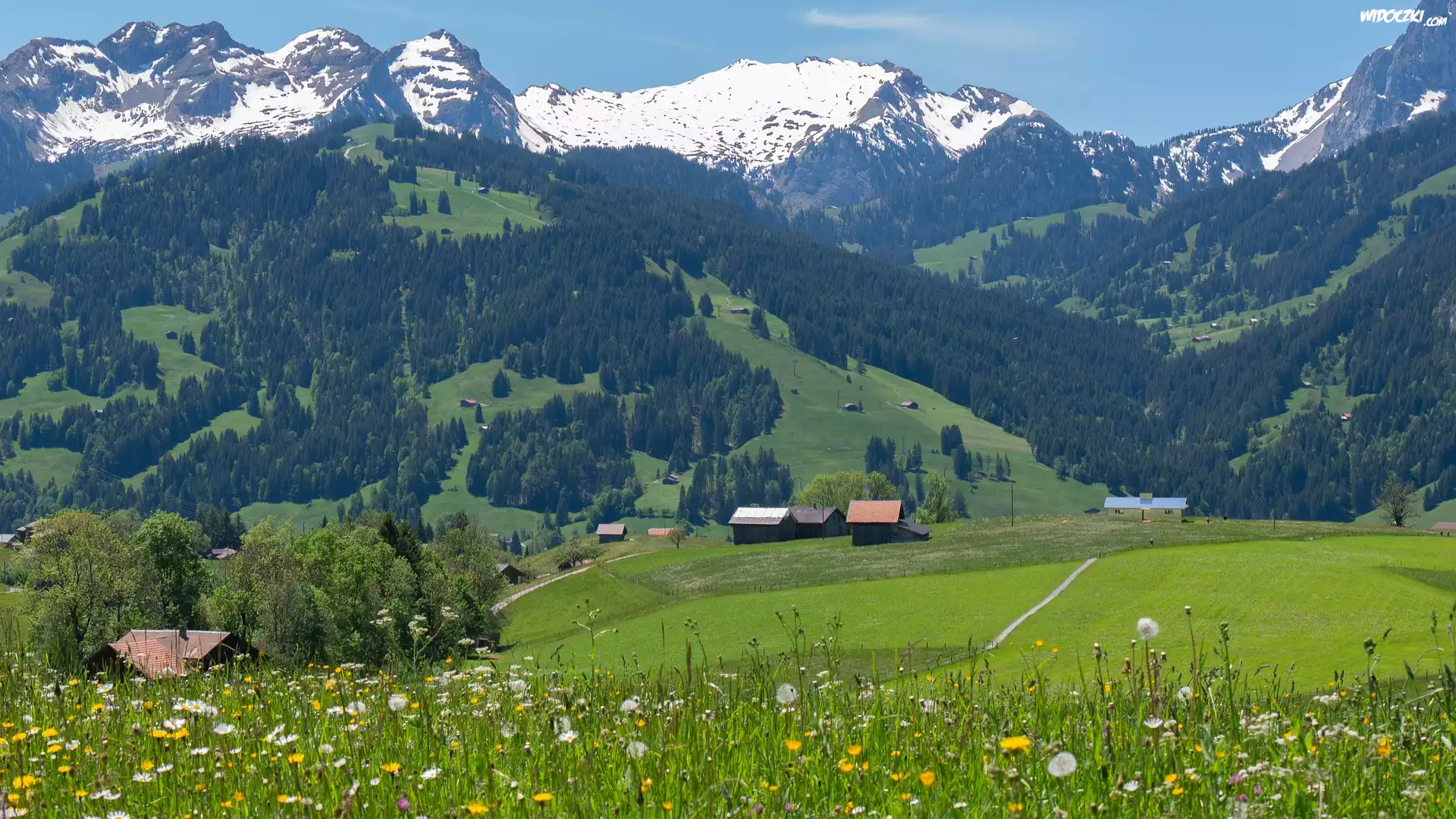 Zdjęcia, Domy, Dolina, Łąka, Alpy, Góry, Alpy, Oberland Berneński, Kanton Berno, Szwajcaria