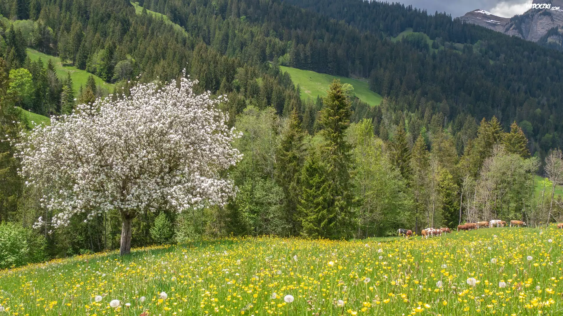Zdjęcia, Wiosna, Łąka, Kwiaty, Kwitnące, Drzewo, Krowy, Las, Góry