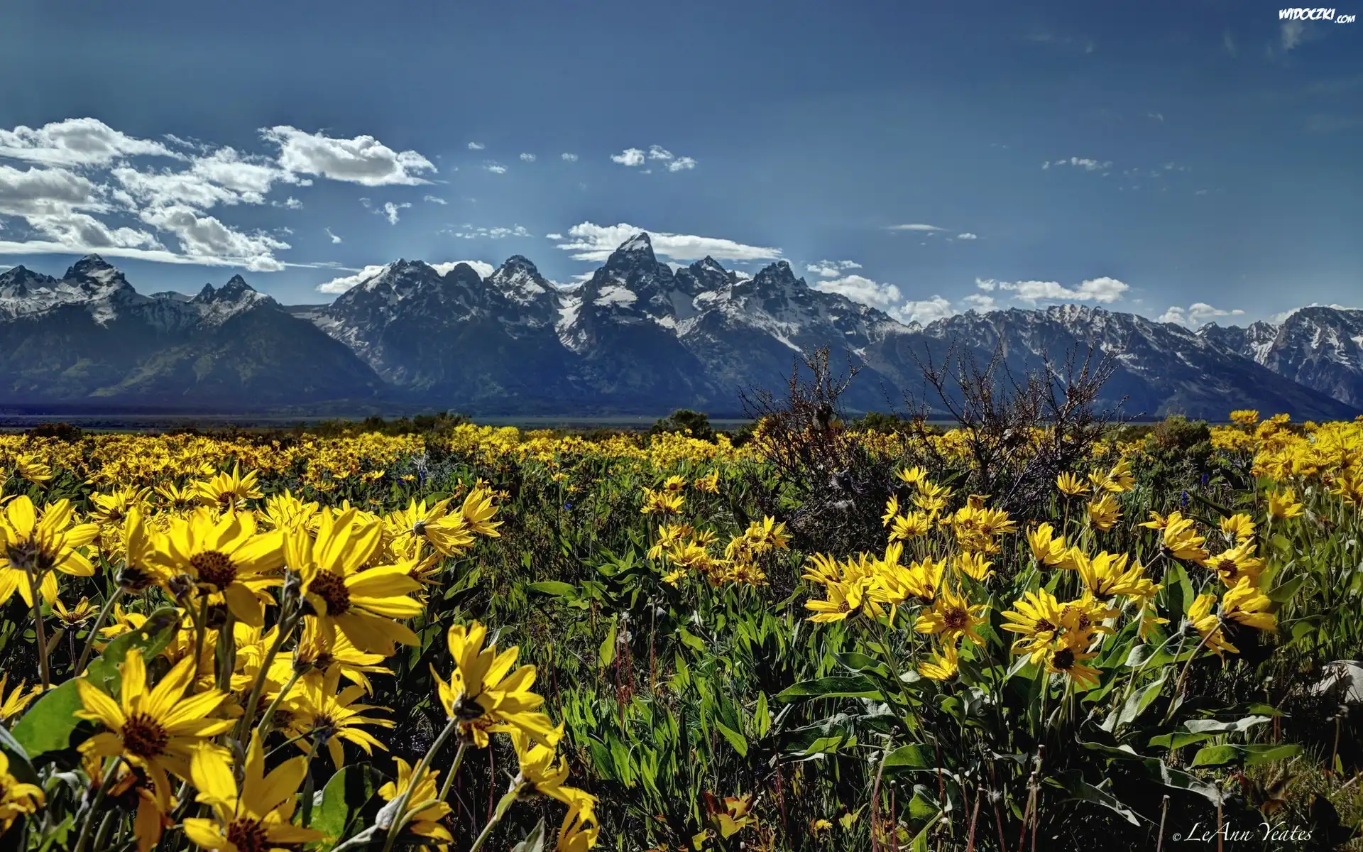 Zdjęcia, Stany Zjednoczone, Stan Wyoming, Park Narodowy Grand Teton, Góry, Kwiaty, Łąka