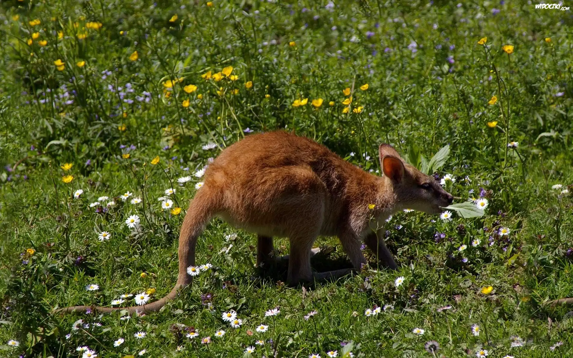 Zdjęcia, Kangur, Łąka, Kwiaty