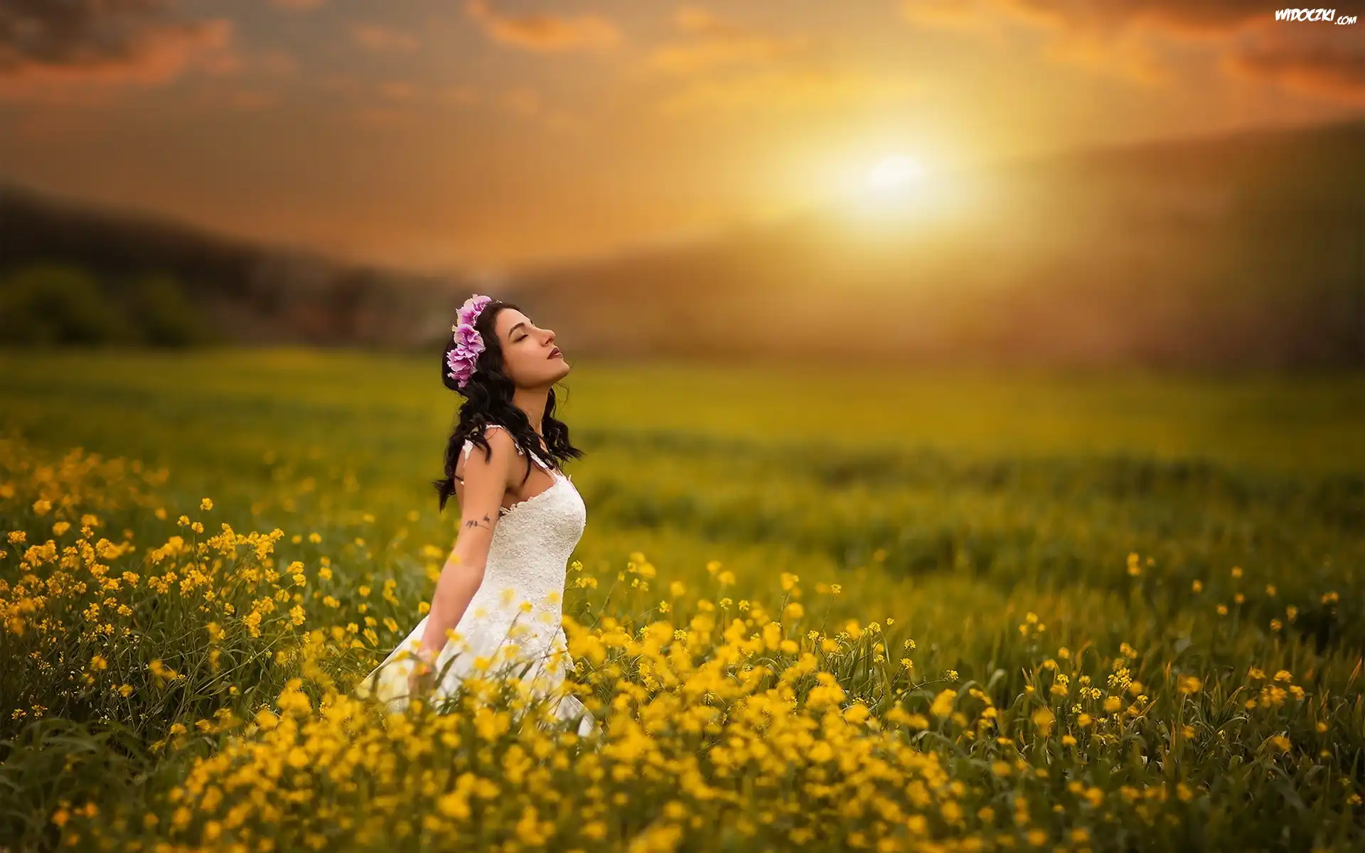 Zdjęcia, Kobieta, Łąka, Kwiaty