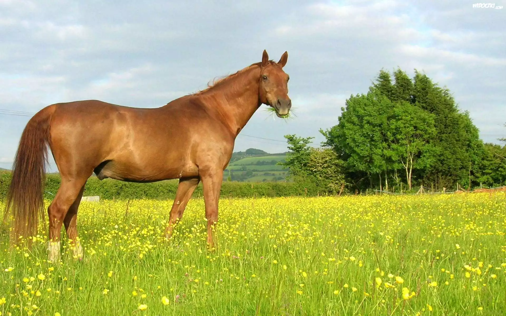 Zdjęcia, Koń, Łąka, Drzewa