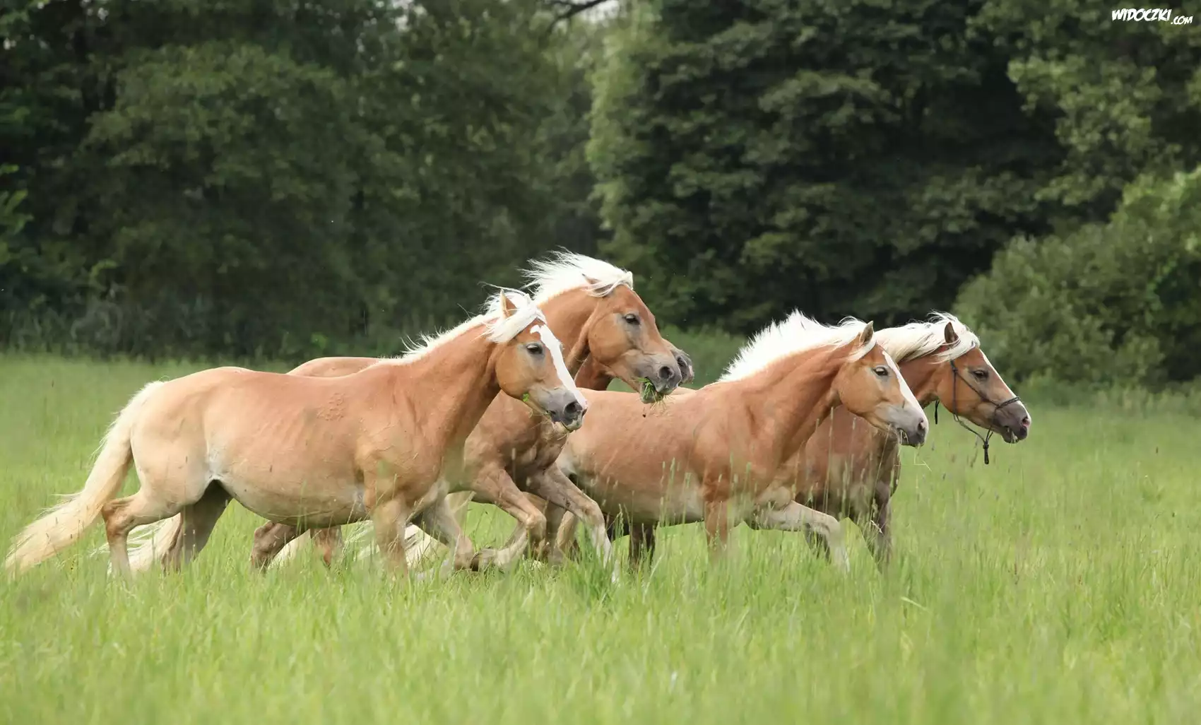 Zdjęcia, Konie, Łąka, Drzewa