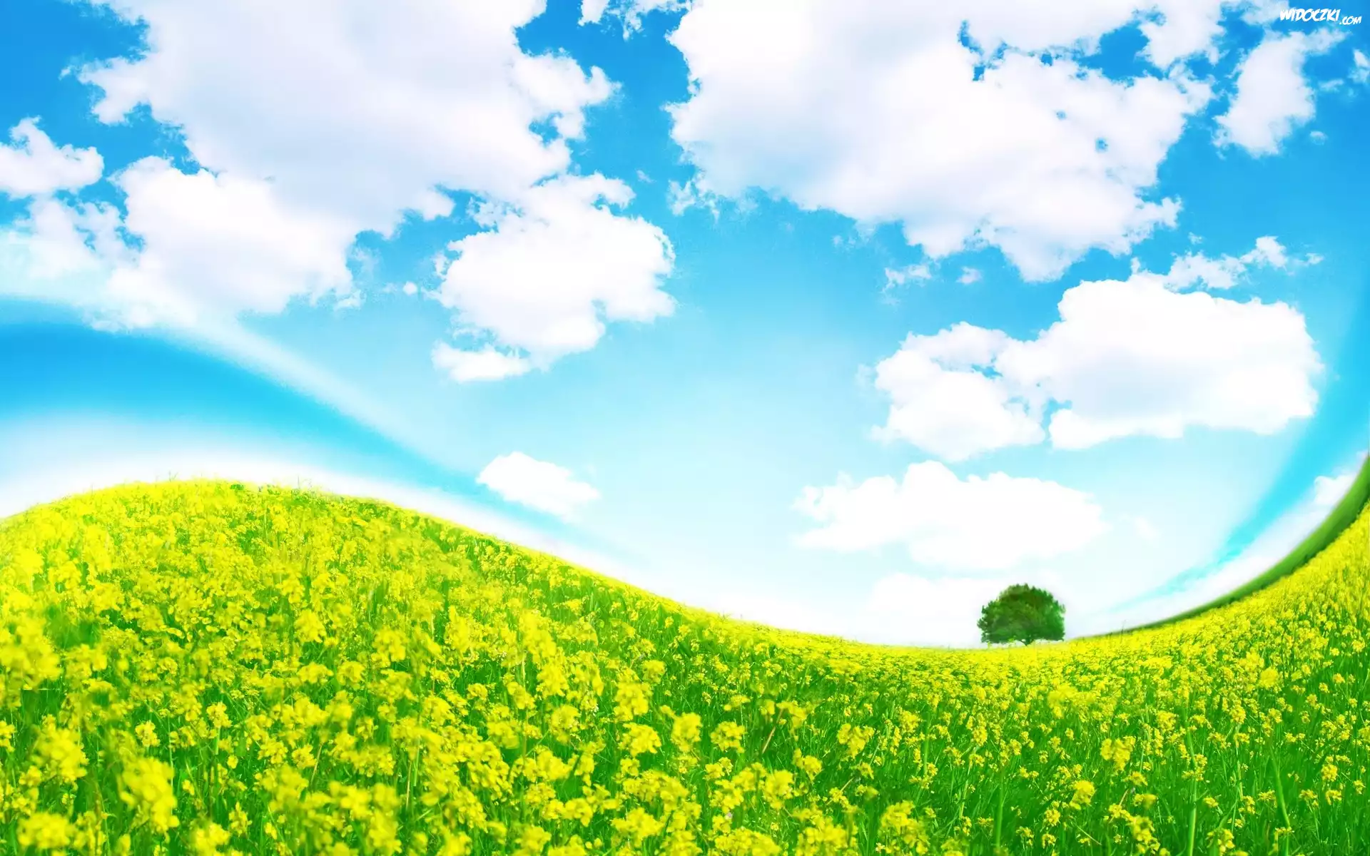 Zdjęcia, Łąka, Drzewko, Błękitne, Niebo, Białe, Chmurki, Lato, 3D
