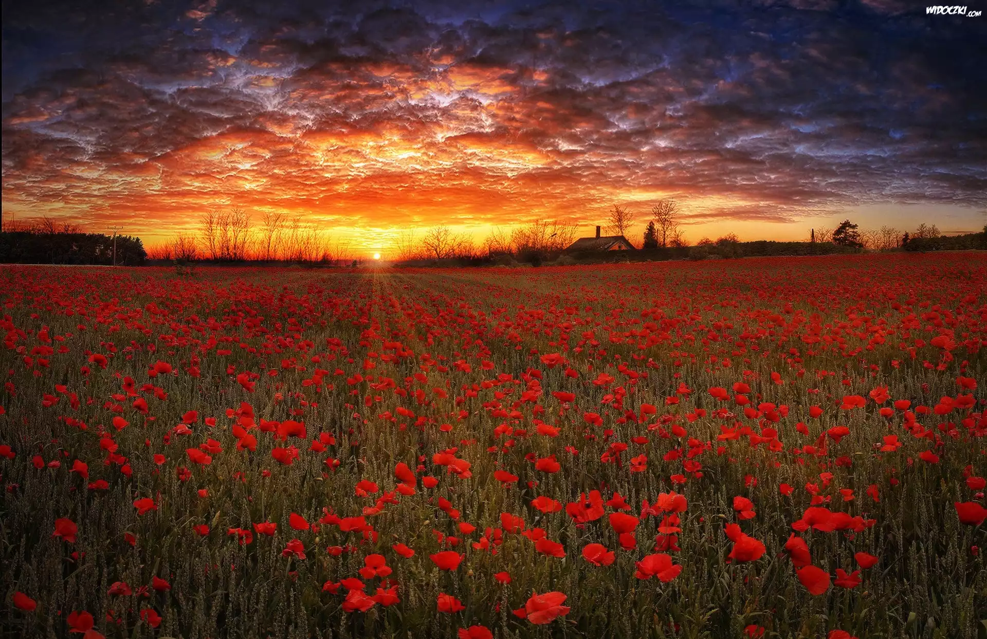 Zdjęcia, Niemcy, Meklemburgia-Pomorze Przednie, Maki, Zachód słońca, Chmury, Drzewa, Łąka