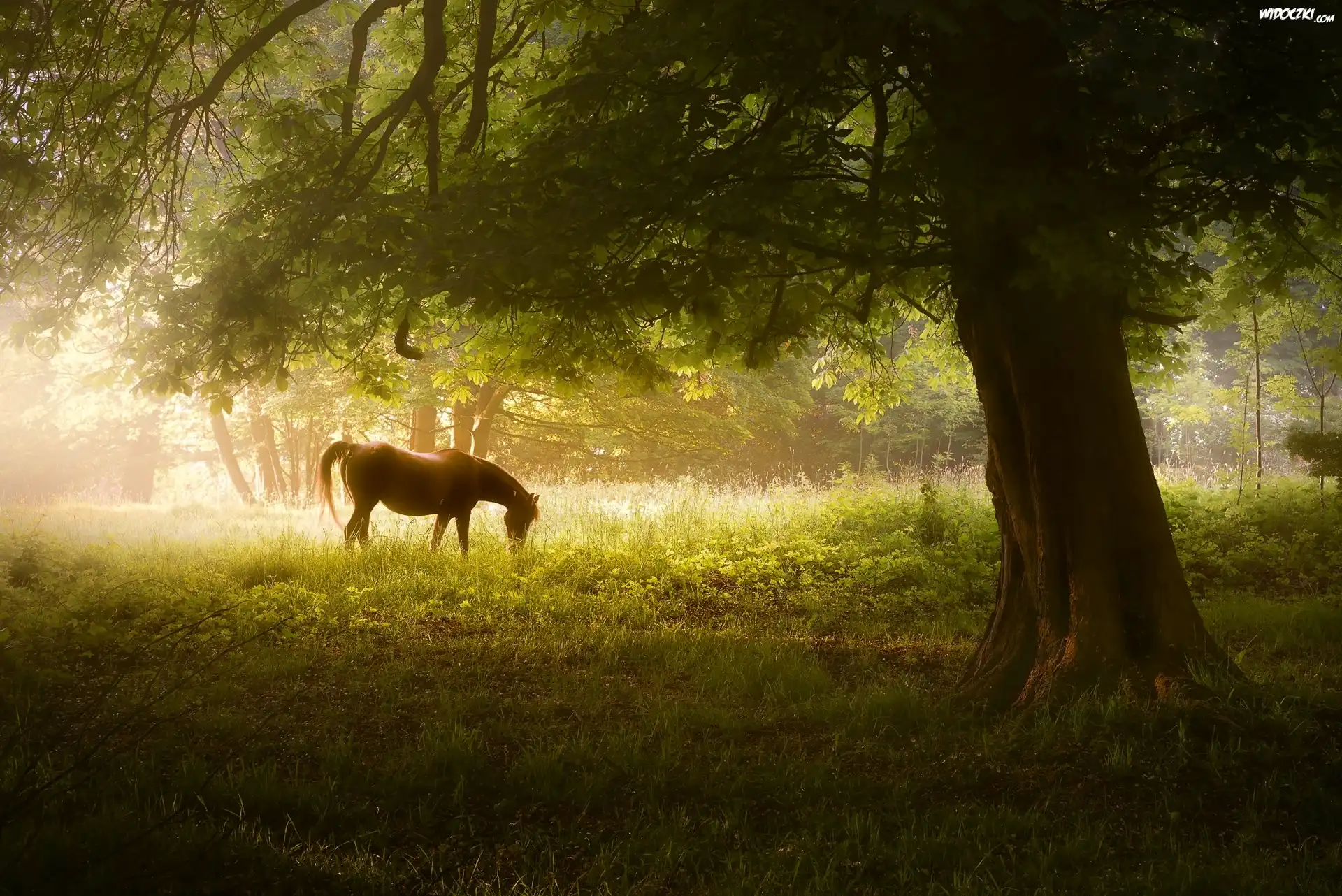 Zdjęcia, Anglia, Hrabstwo Derbyshire, Park Narodowy Peak District, Drzewo, Koń, Łąka