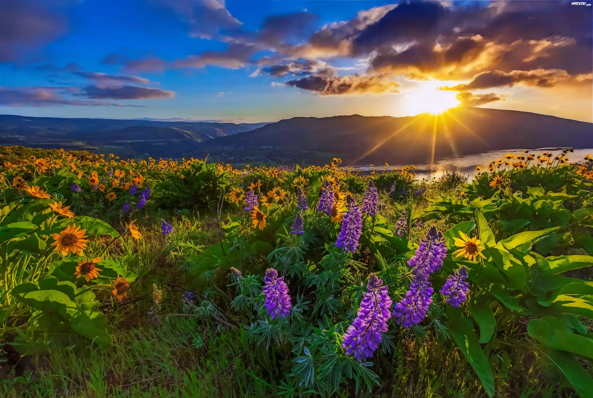 Zdjęcia, Łąka, Kwiaty, Jezioro, Góry, Chmury, Promienie, Słońca