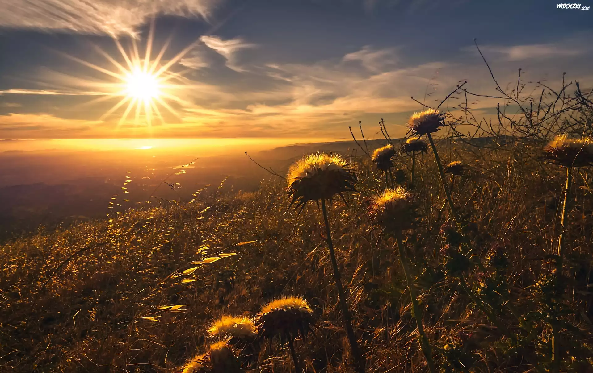 Zdjęcia, Łąka, Rośliny, Promienie słońca, Świt, Wschód słońca