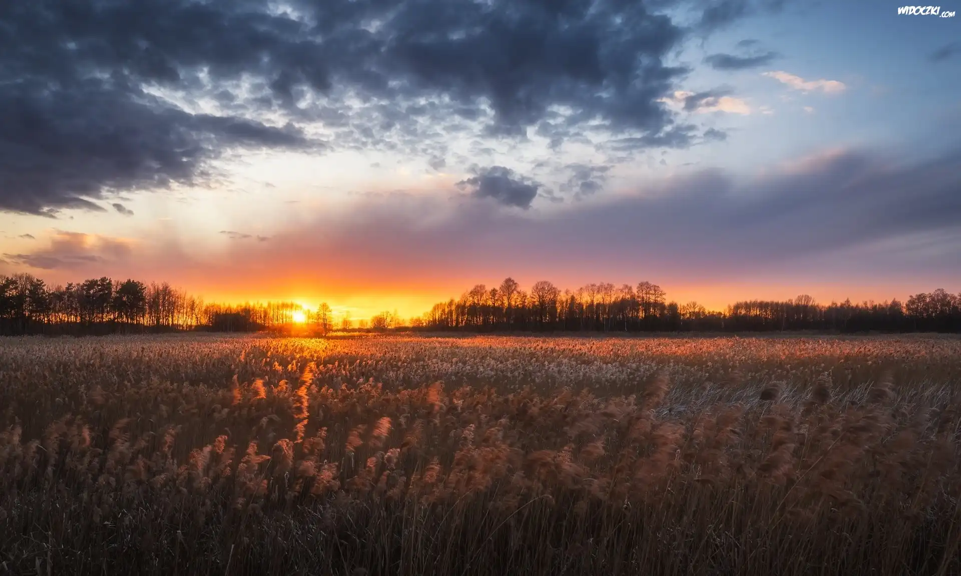 Łąki, Trawy, Drzewa, Zachód słońca, Chmury