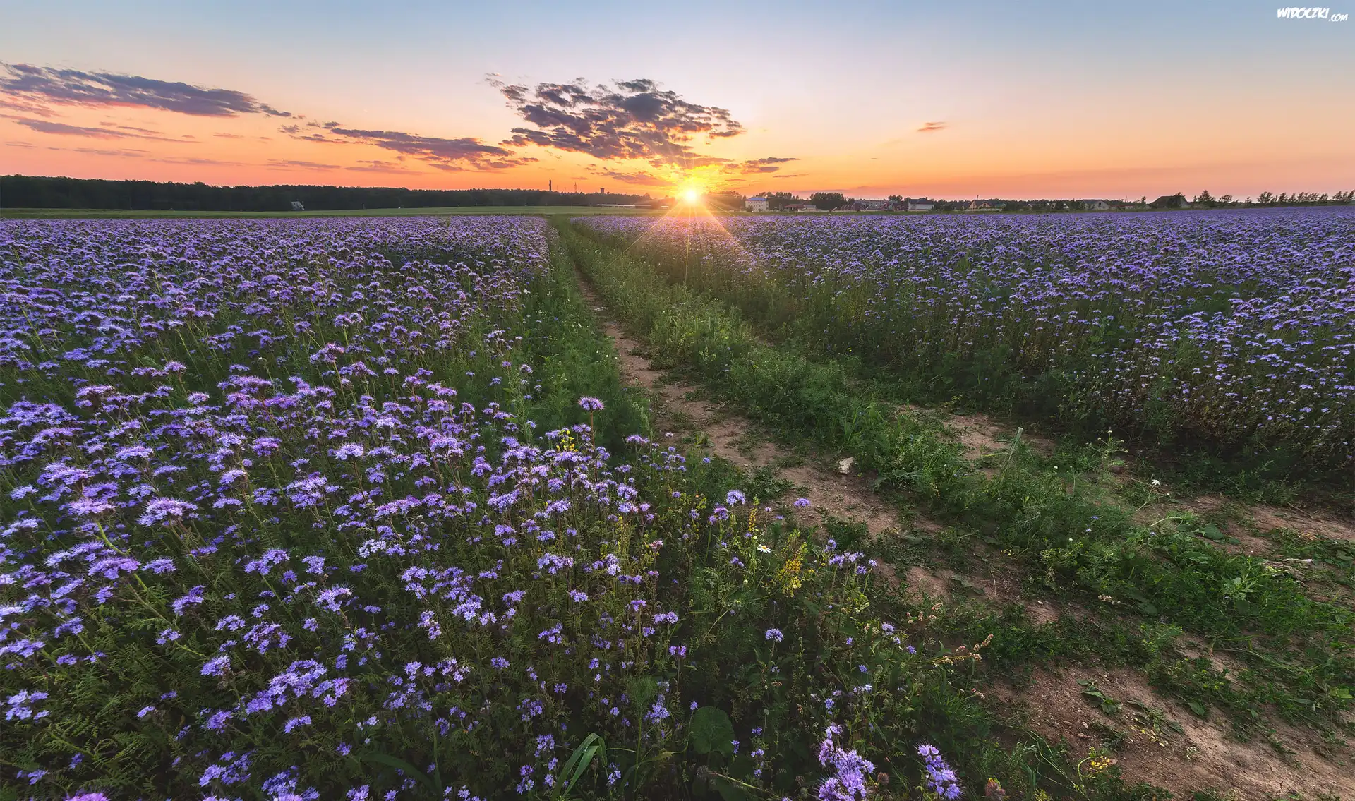 Łąki, Droga, Fioletowe, Kwiaty, Promienie słońca