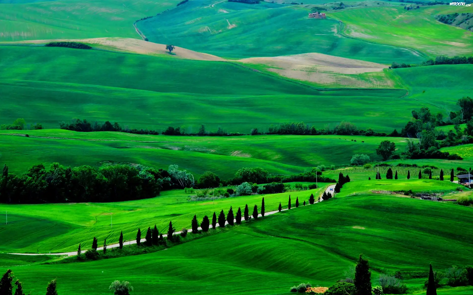 Zdjęcia, Łąki, Góry, Droga, Drzewa, Toskania, Włochy
