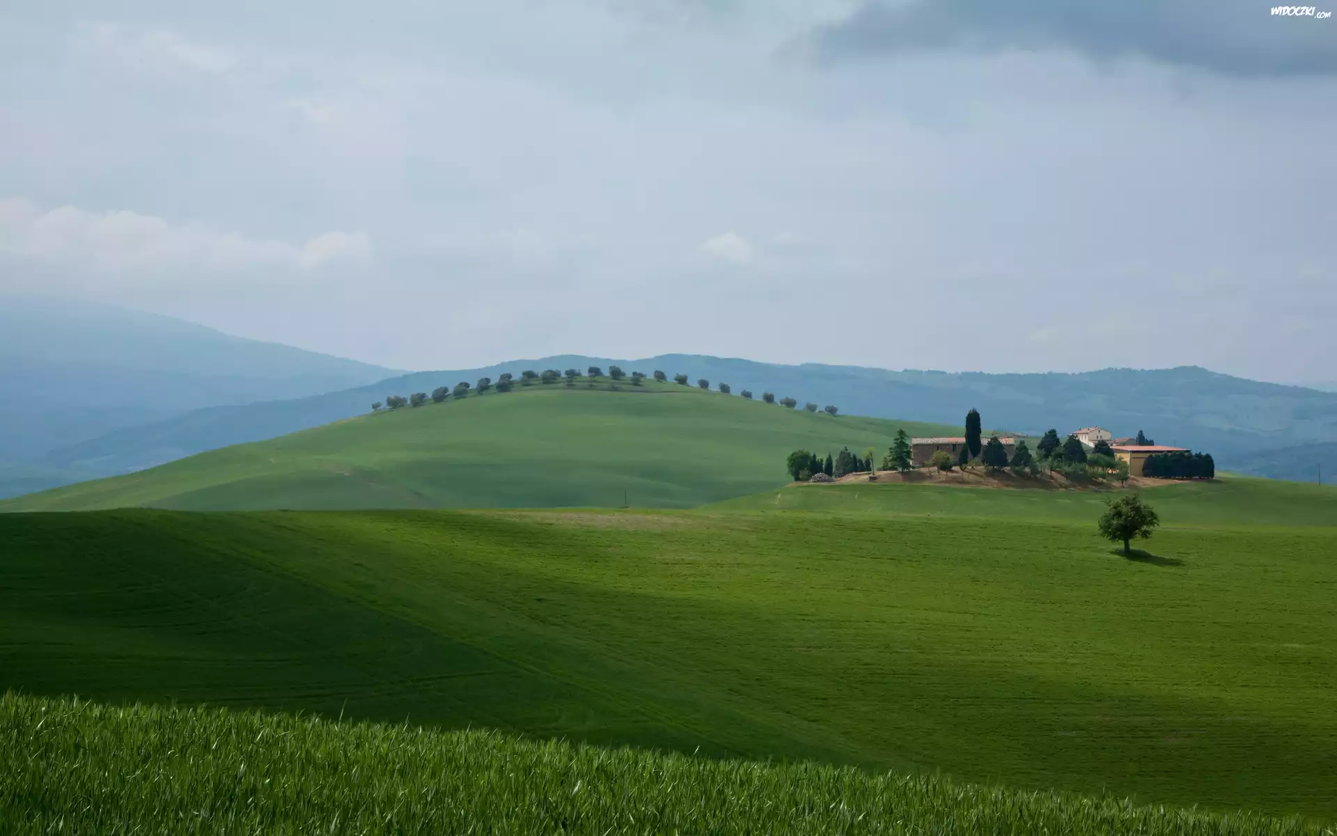 Zdjęcia, Łąki, Domy, Drzewa, Góry, Toskania, Włochy