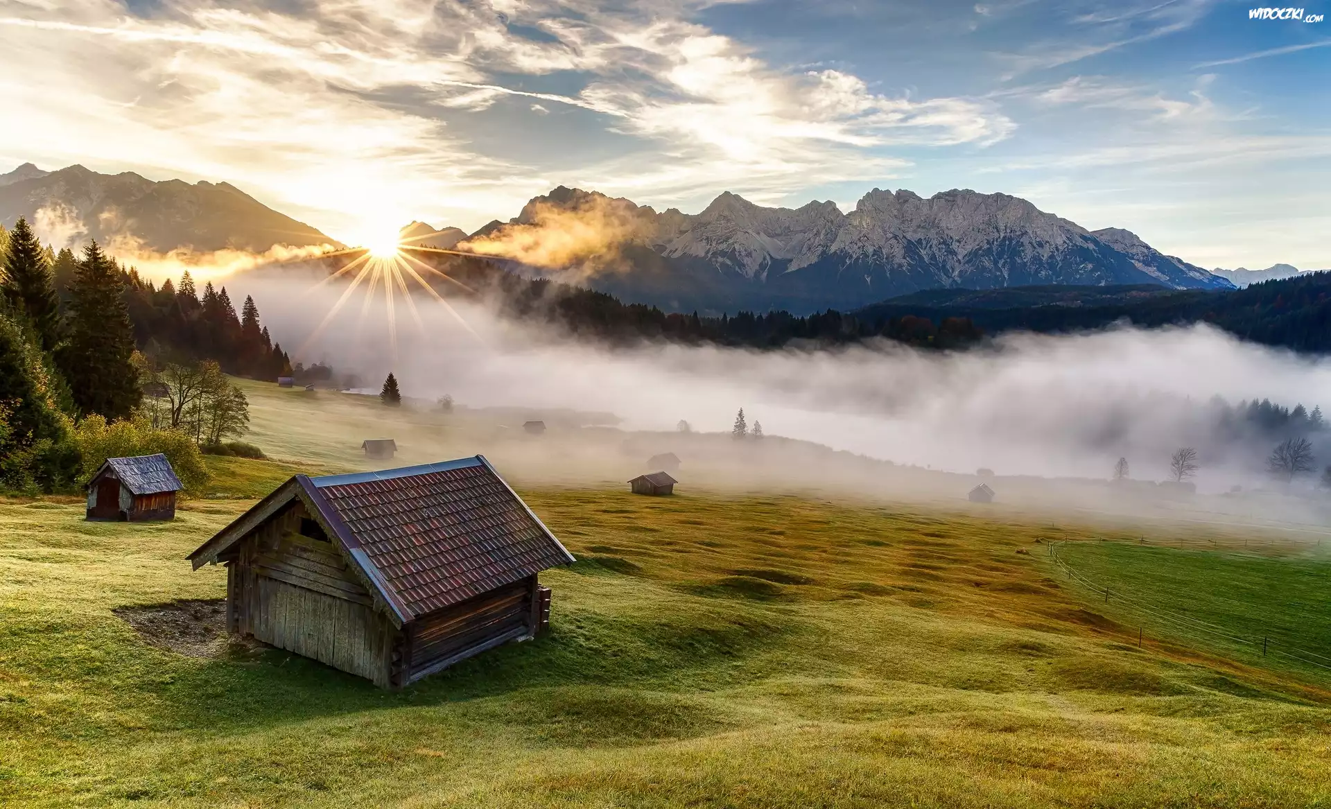 Zdjęcia, Góry, Łąki, Szopy, Lasy, Promienie, Słońca, Mgła