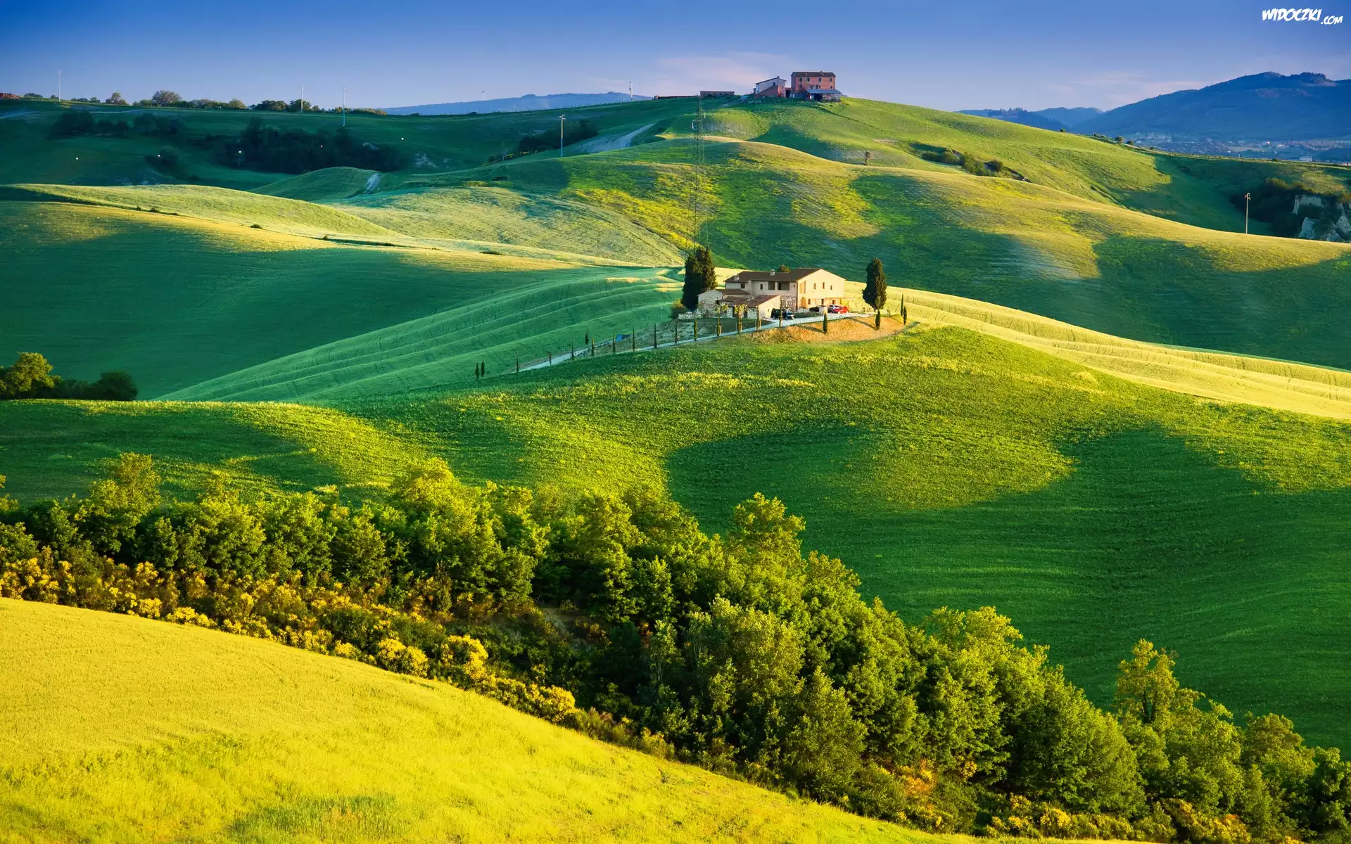 Zdjęcia, Łąki, Domy, Drzewa, Góry, Toksania, Wieś, Włochy