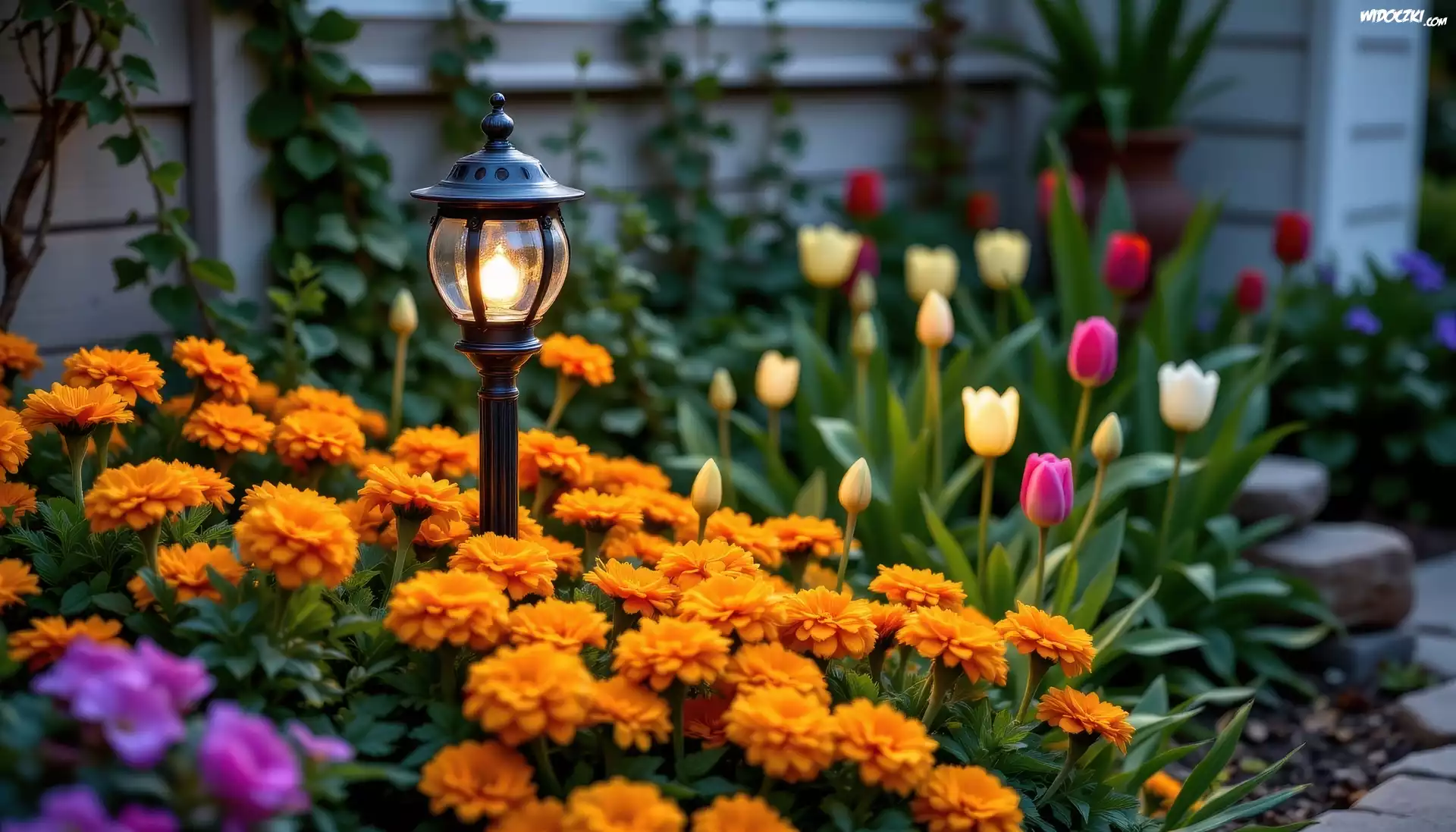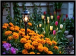 Zdjęcia, Ogród, Latarnia, Kwiaty, Aksamitki, Tulipany, Bluszcz, AI
