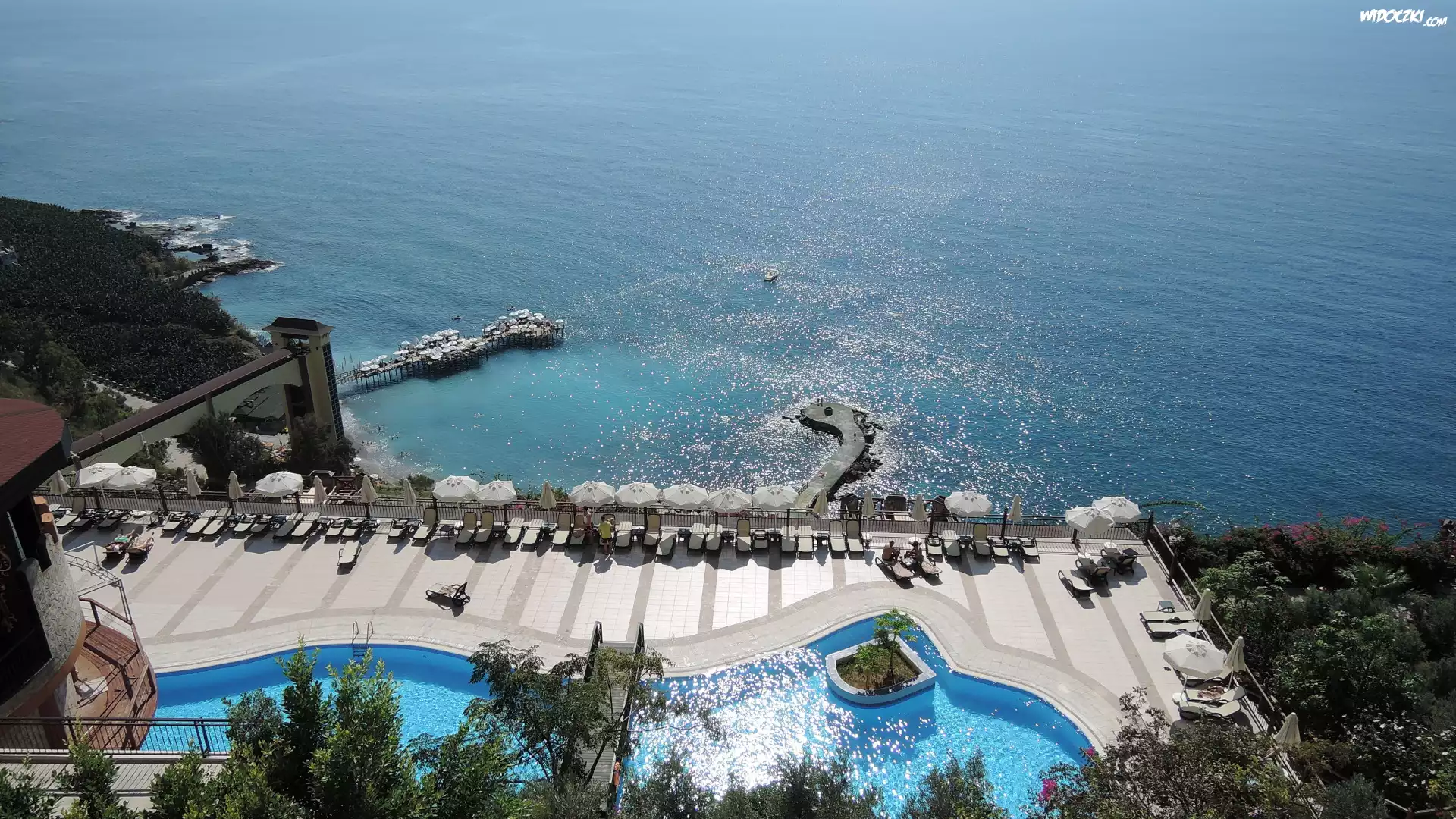 Zdjęcia, Turcja, Alanya, Taras, Basen, Leżaki, Parasole, Drzewa, Morze