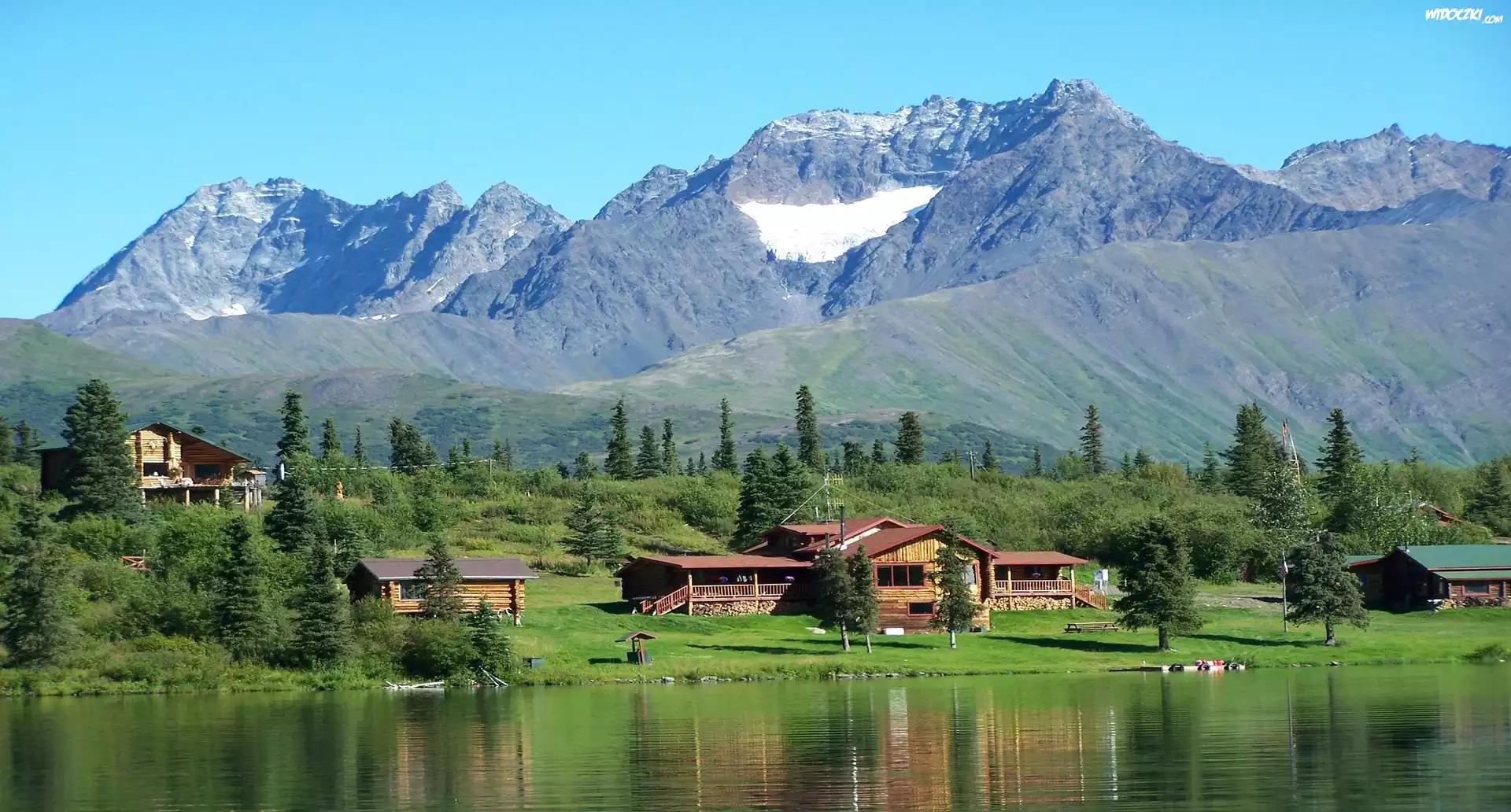 Góra Góra, Drewniana chatka Góra, Niebo Góra, Jeziora Góra Góra Góra Zachód Słońca, Góra Góra, Niebo Góra Góra Góra, Las Góra, Niebo Góra