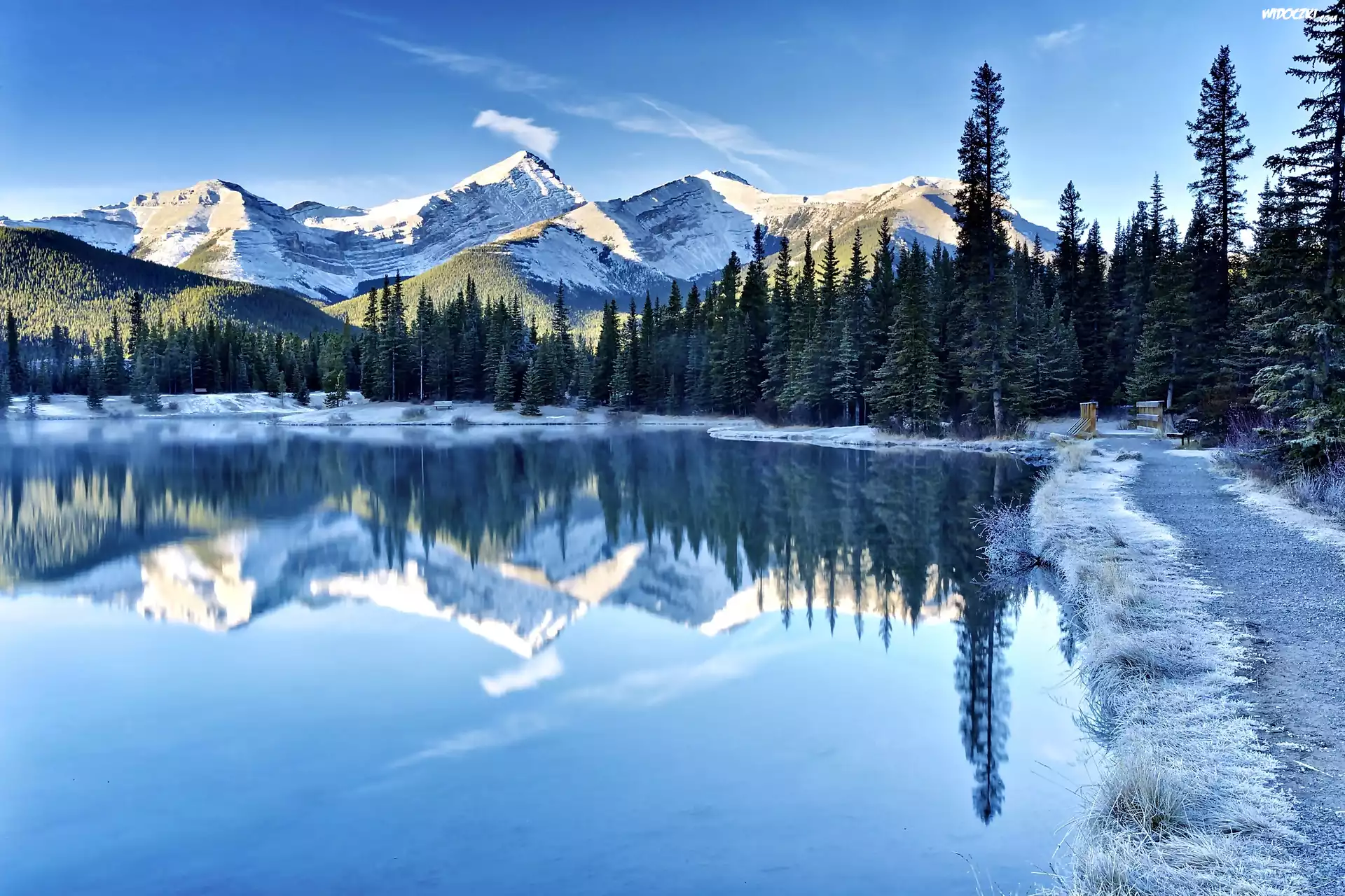 Zdjęcia, Kanada, Alberta, Jezioro Kananaskis, Góry, Lasy, Droga, Zima