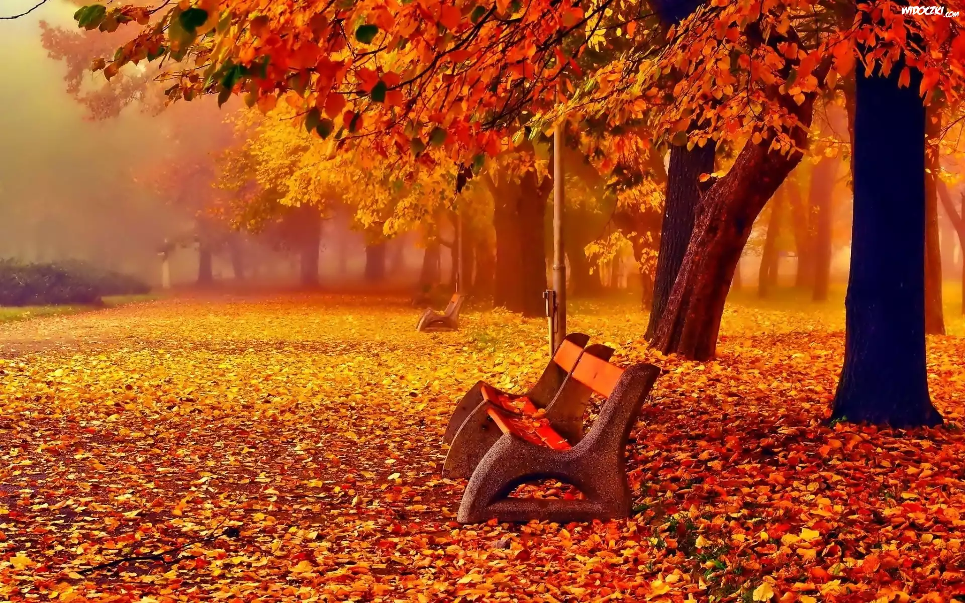 Zdjęcia, Park, Aleja, Ławki, Drzewa, Liście, Mgła, Jesień