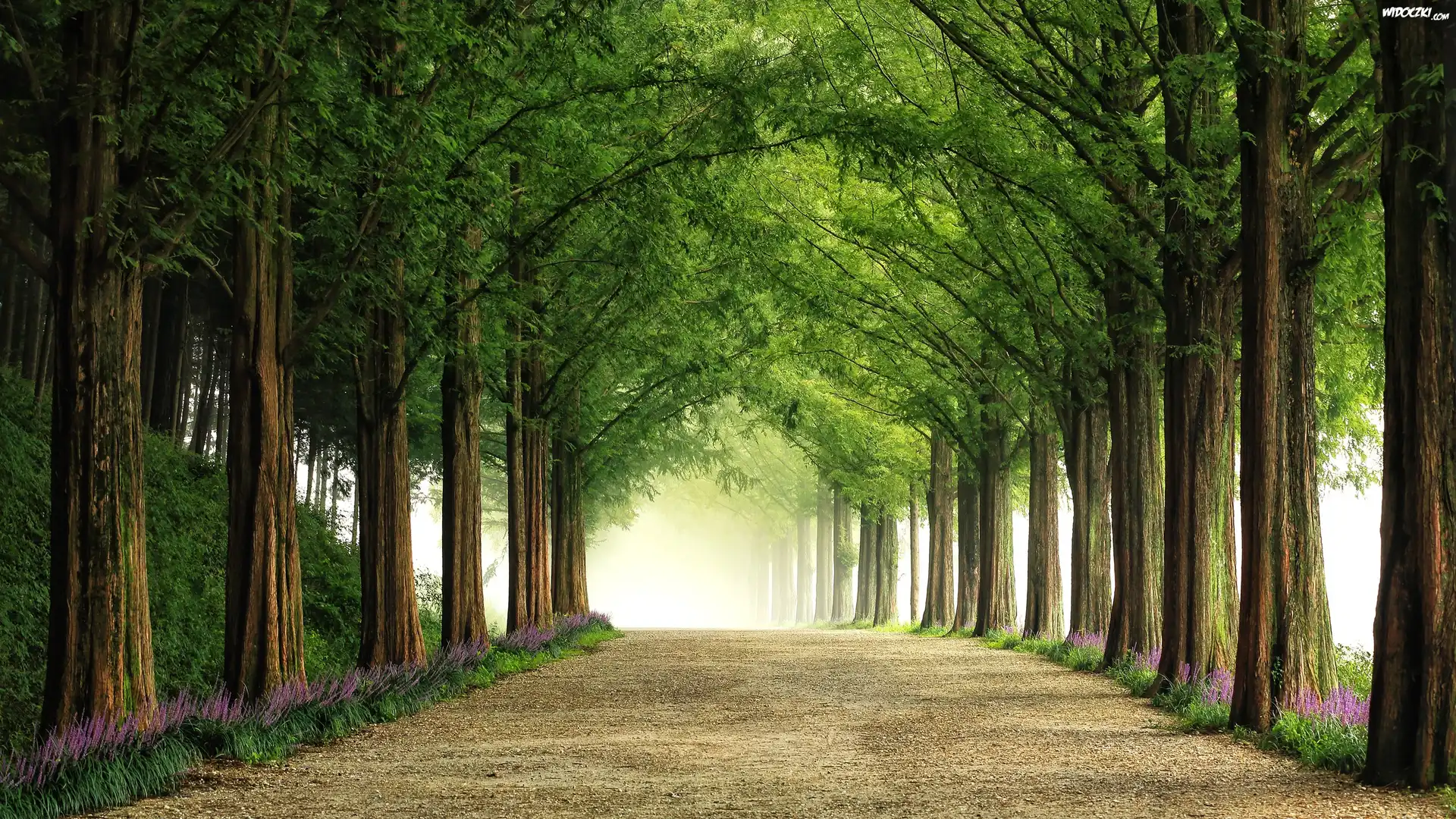 Zdjęcia, Aleja, Droga, Szpalery, Drzewa, Wrzosy, Mgła
