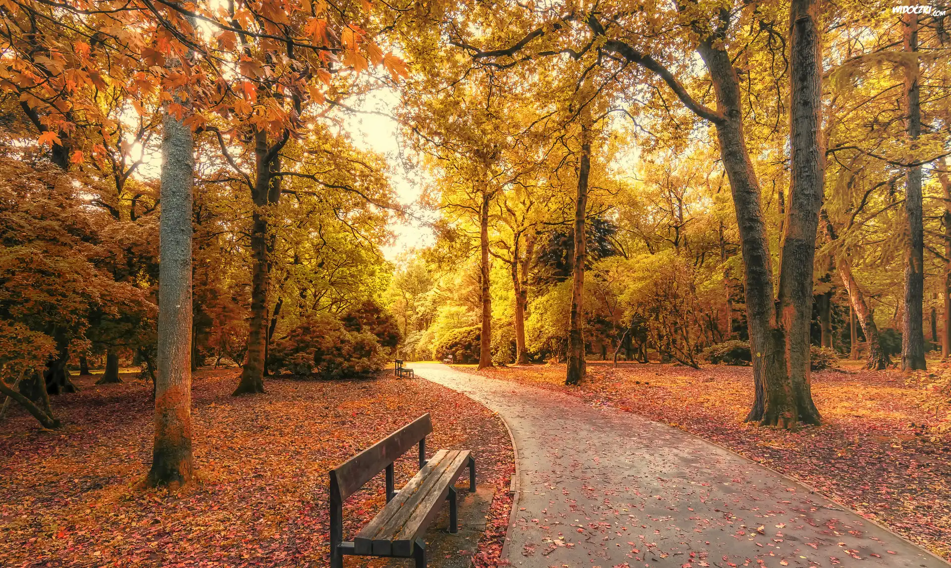 Zdjęcia, Alejka, Park, Ławki, Jesień