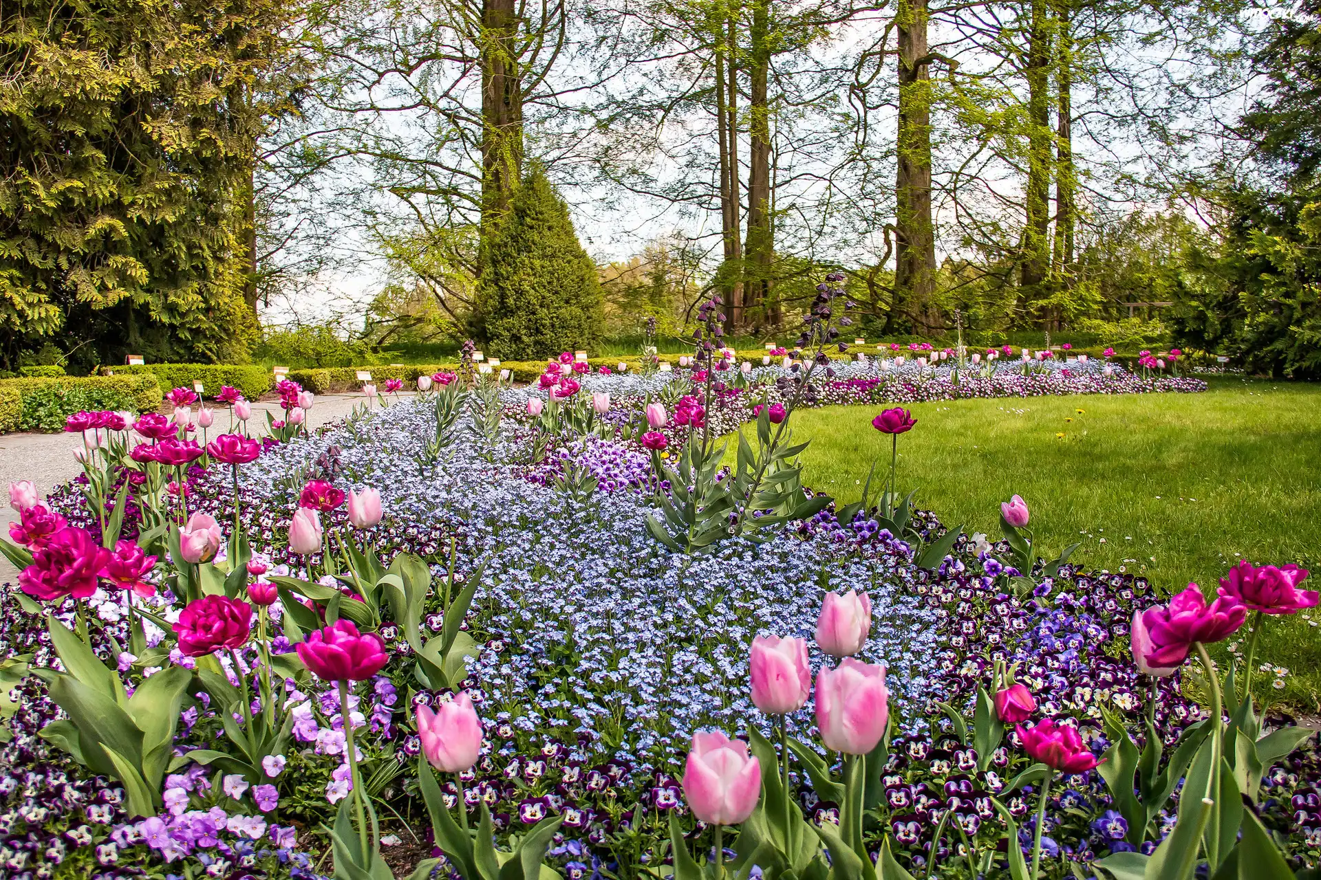 Zdjęcia, Park, Alejka, Drzewa, Kwiaty, Tulipany, Niezapominajki, Bratki, Wiosna