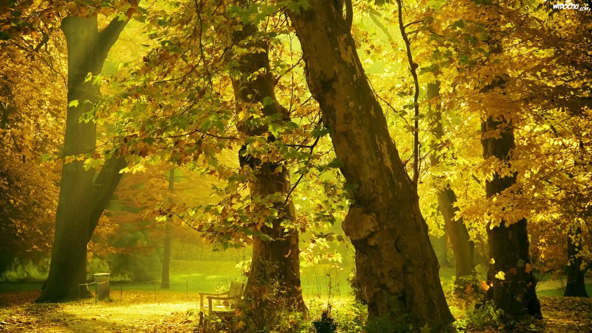 Zdjęcia, Park, Alejki, Ławki, Przebijające, Światło, Jesień, Drzewo