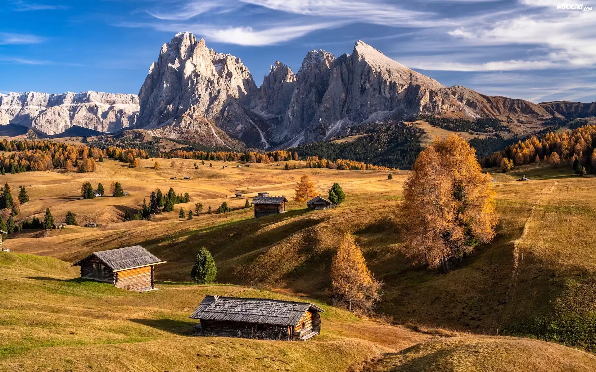 Zdjęcia, Włochy, Płaskowyż Seiser Alm, Dolina Val Gardena, Góry Sassolungo, Dolomity, Domy, Drzewa, Jesień