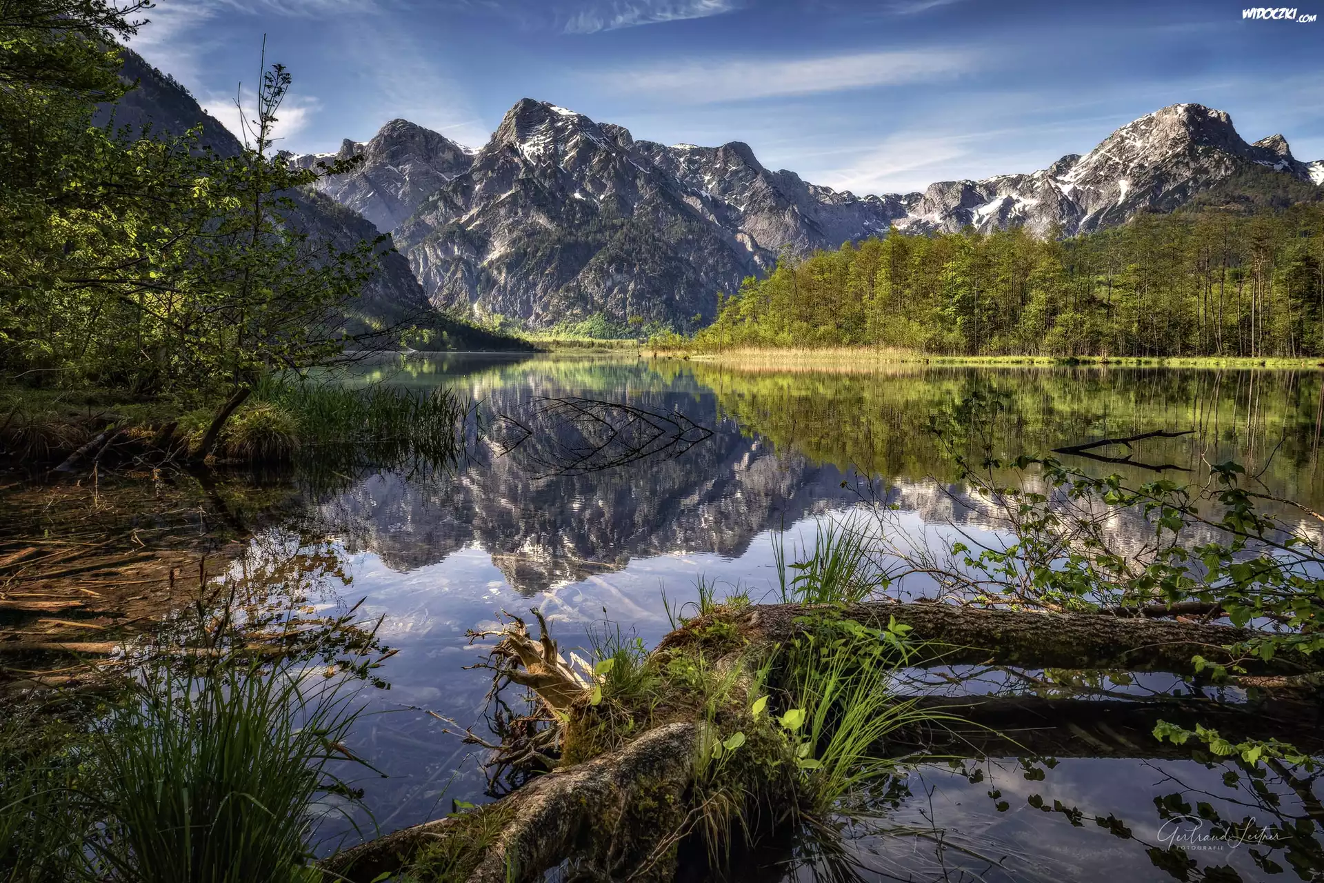 Zdjęcia, Austria, Góry, Jezioro, Almsee, Drzewa, Odbicie
