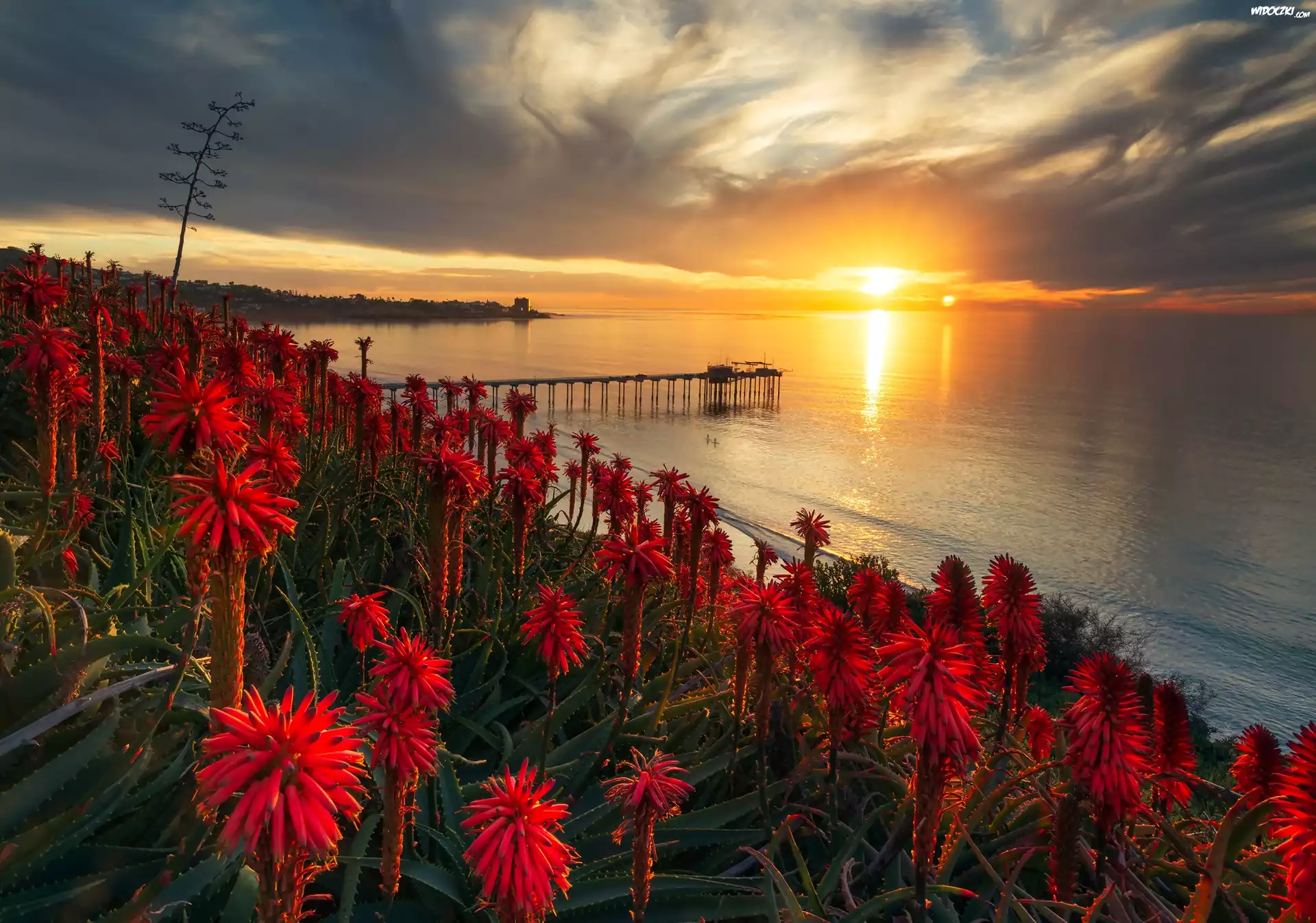 Zdjęcia, Stany Zjednoczone, San Diego, Ocean Spokojny, Zachód słońca, Molo, Aloes