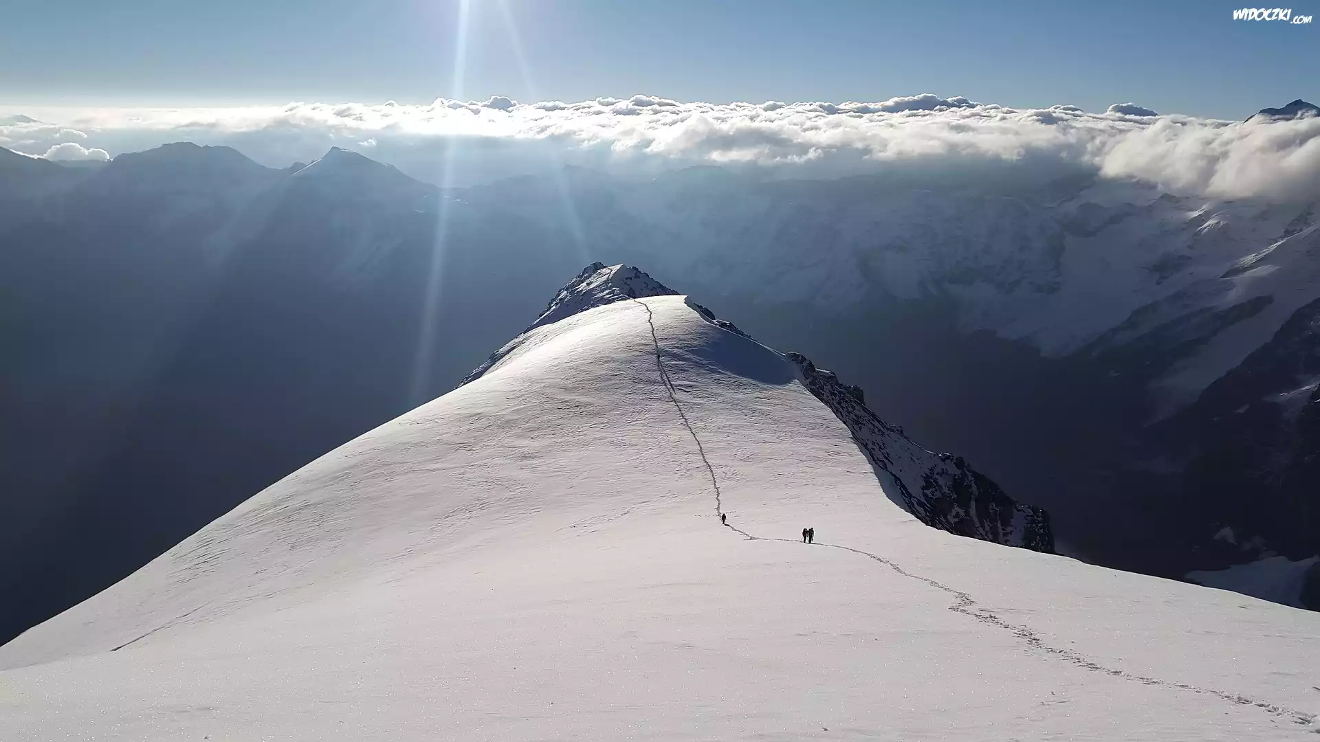 Alpinizm, Ślady, Góry, Zima, Chmury