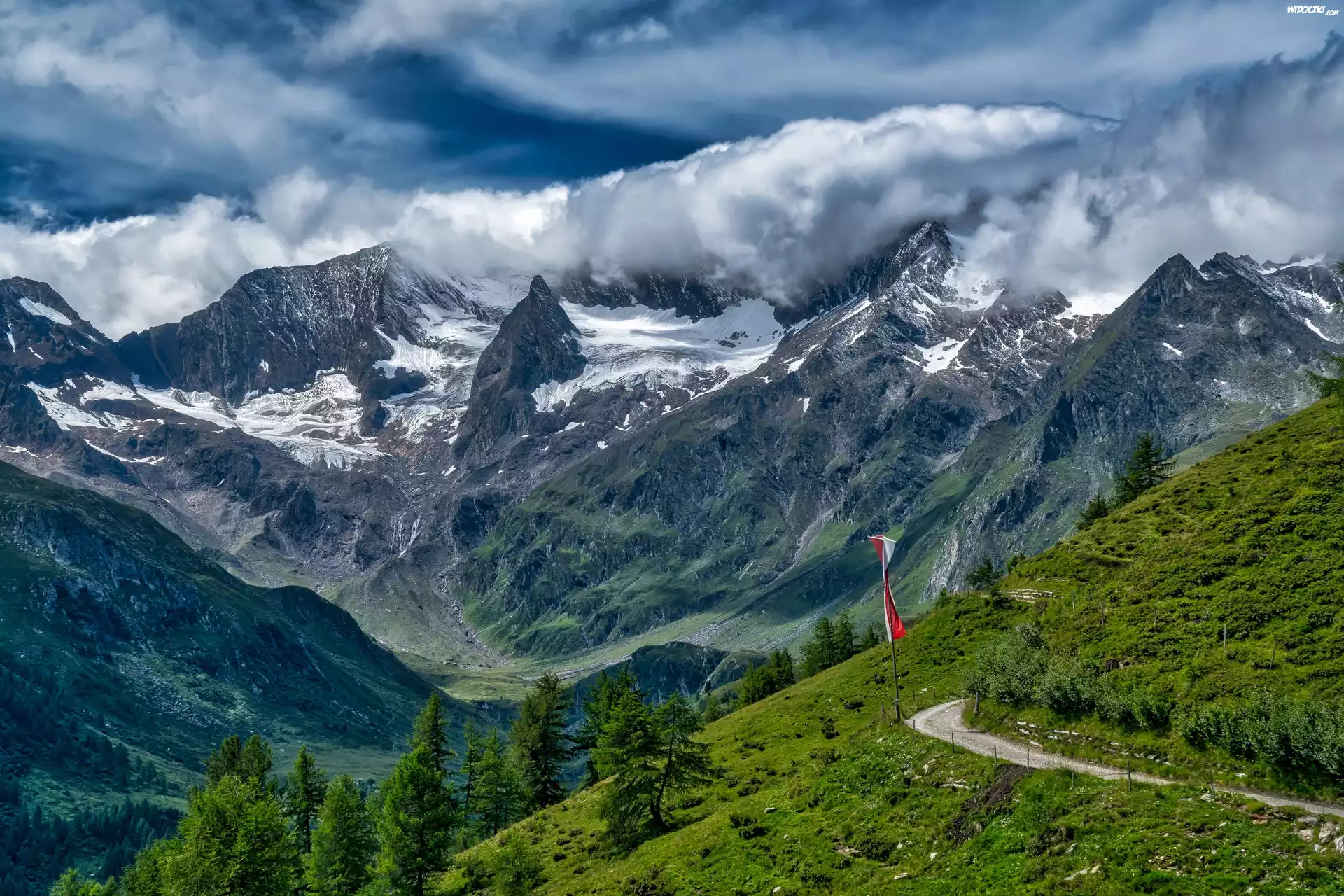 Alpy Ötztalskie, Granica, Drzewa, Droga, Chmury