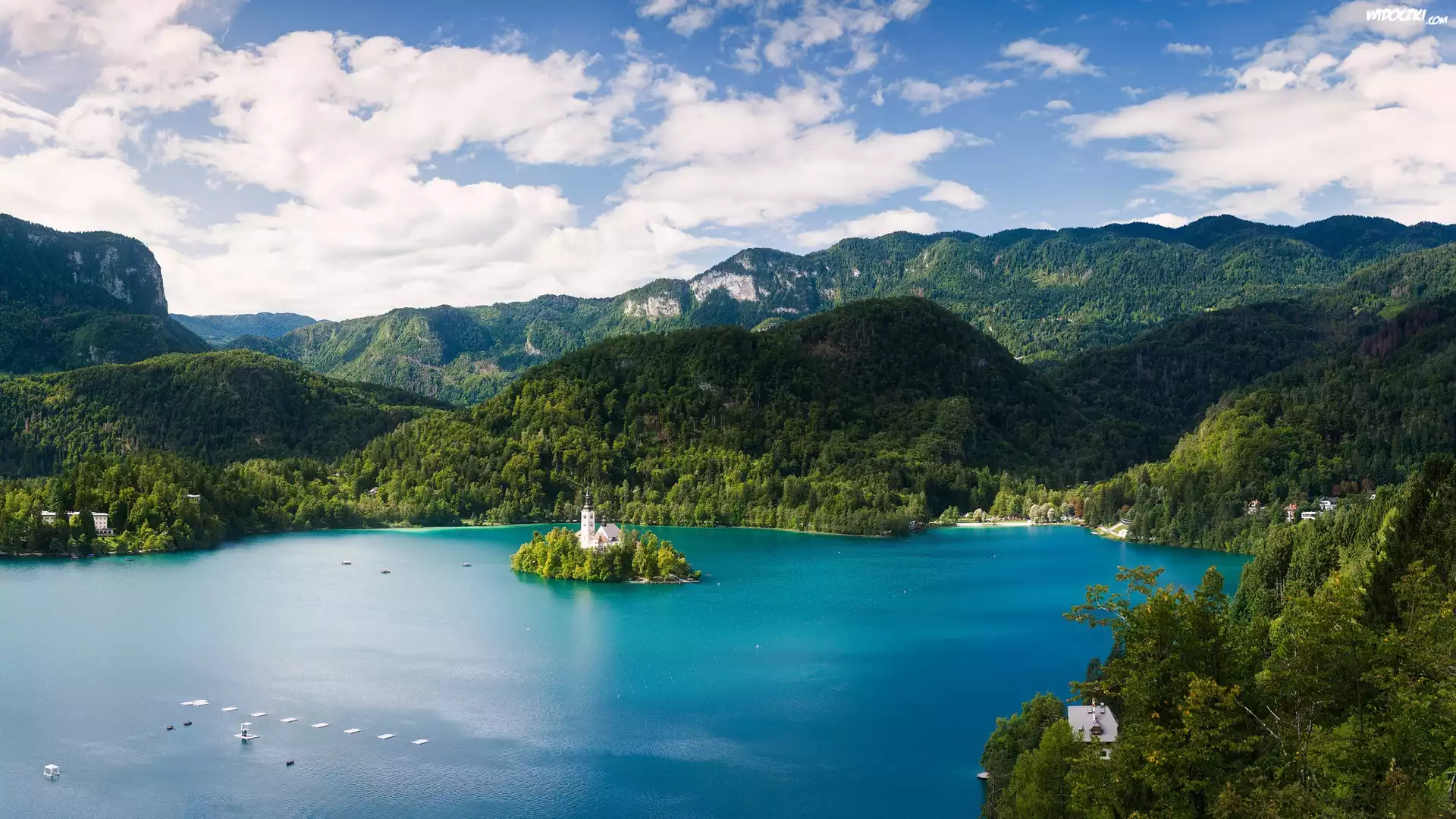 Zdjęcia, Słowenia, Góry Alpy Julijskie, Jezioro Bled, Wyspa Blejski Otok, Drzewa, Chmury