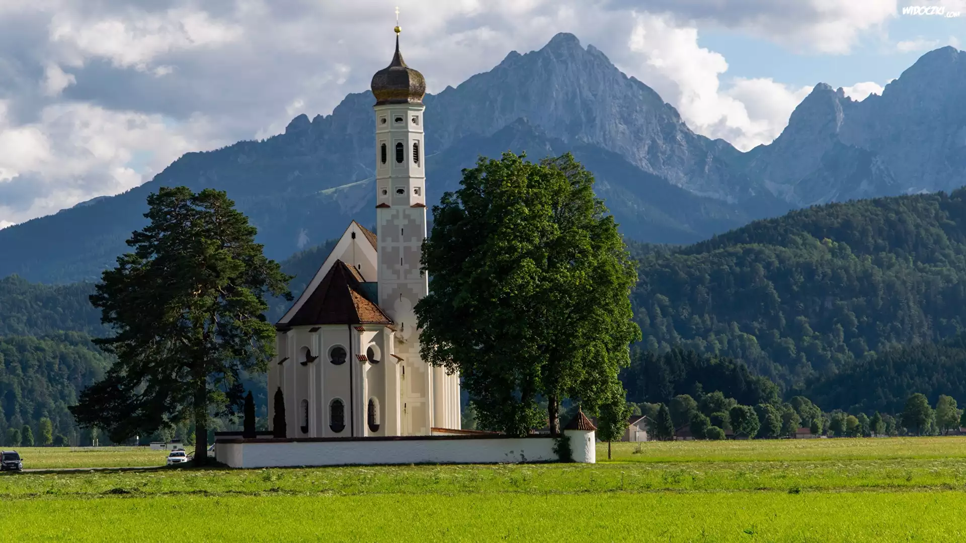 Zdjęcia, Kościół, Eglise Saint Coloman, Góry Alpy, Las, Drzewa, Miejscowość Schwangau, Bawaria, Niemcy