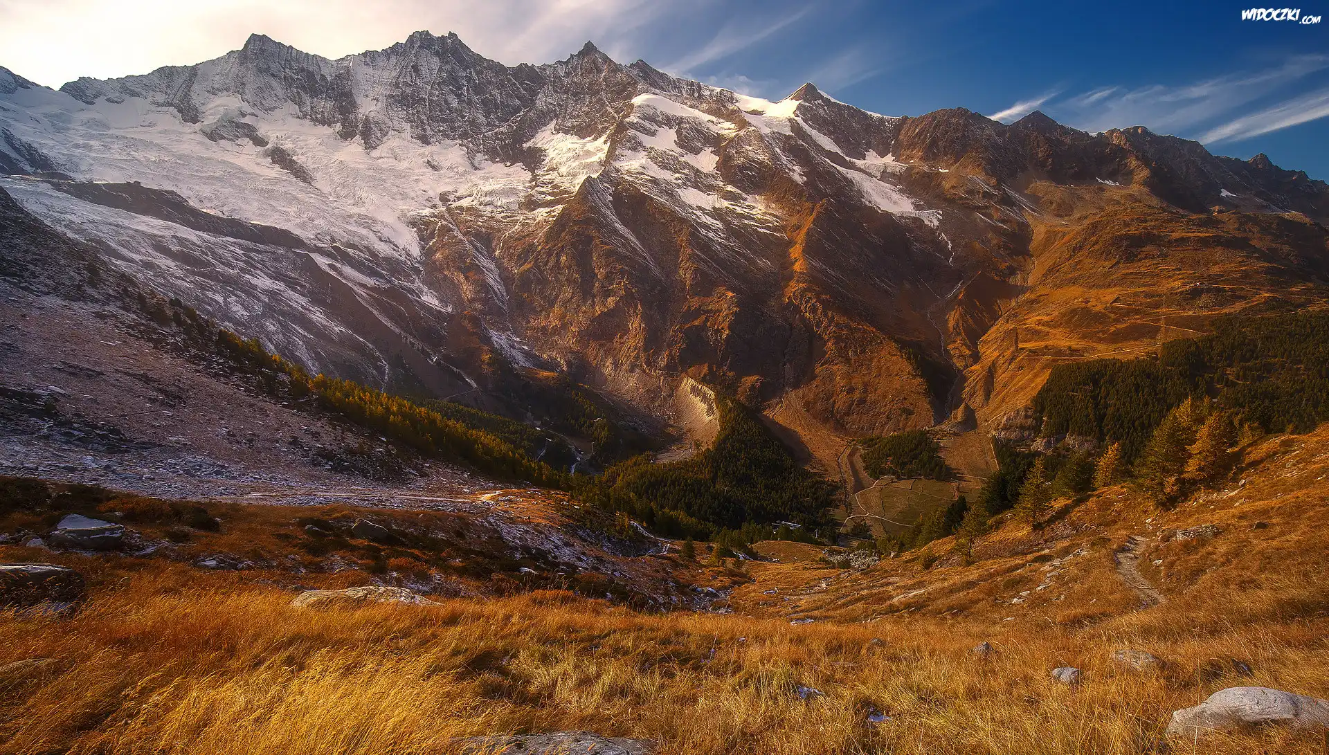 Zdjęcia, Szwajcaria, Kanton Valais, Saas-Fee, Alpy Pienińskie, Góry, Trawa, Kamienie, Skały, Jesień