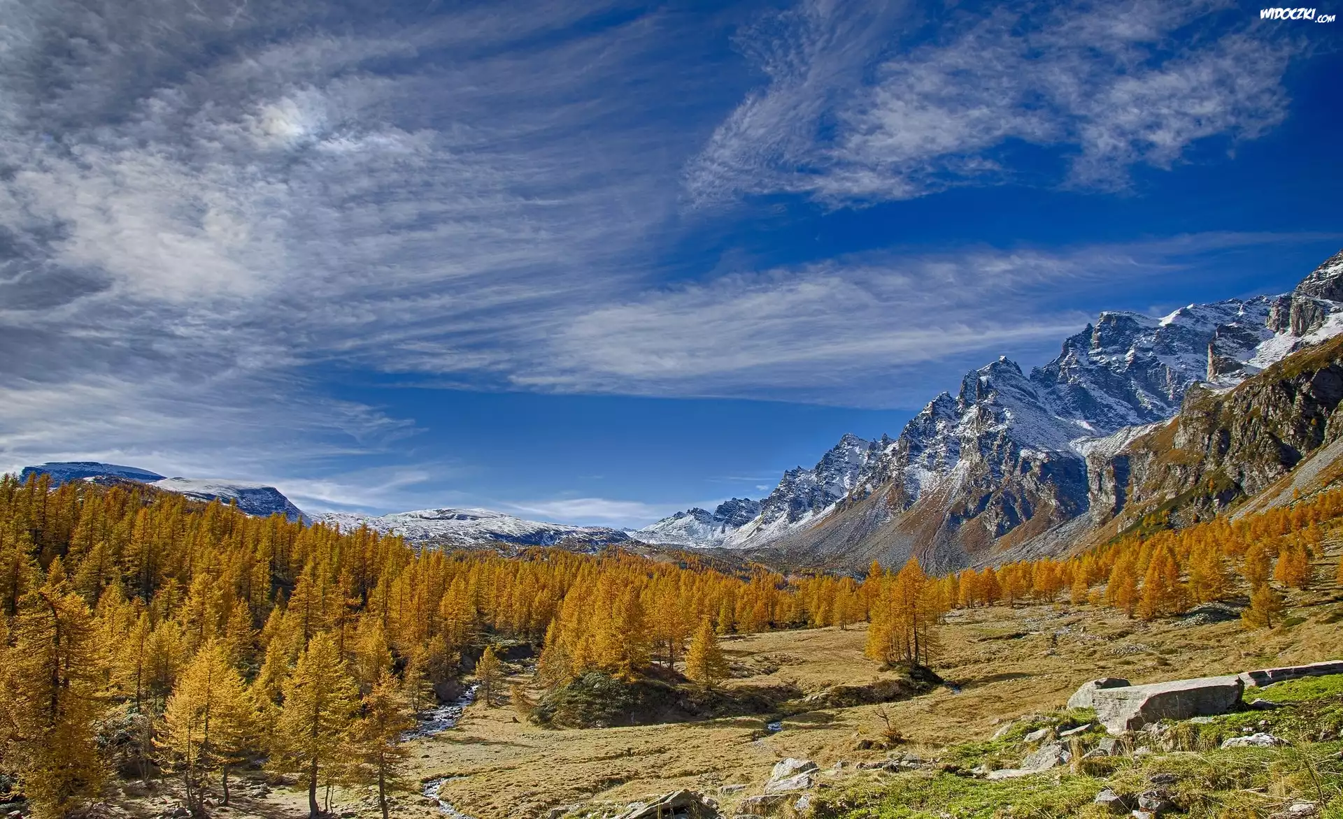 Włochy, Region Piemont, Góry Alpy, Dolina Val Buscagna, Ośrodek narciarski Alpe Devero, Jesień, Drzewa |