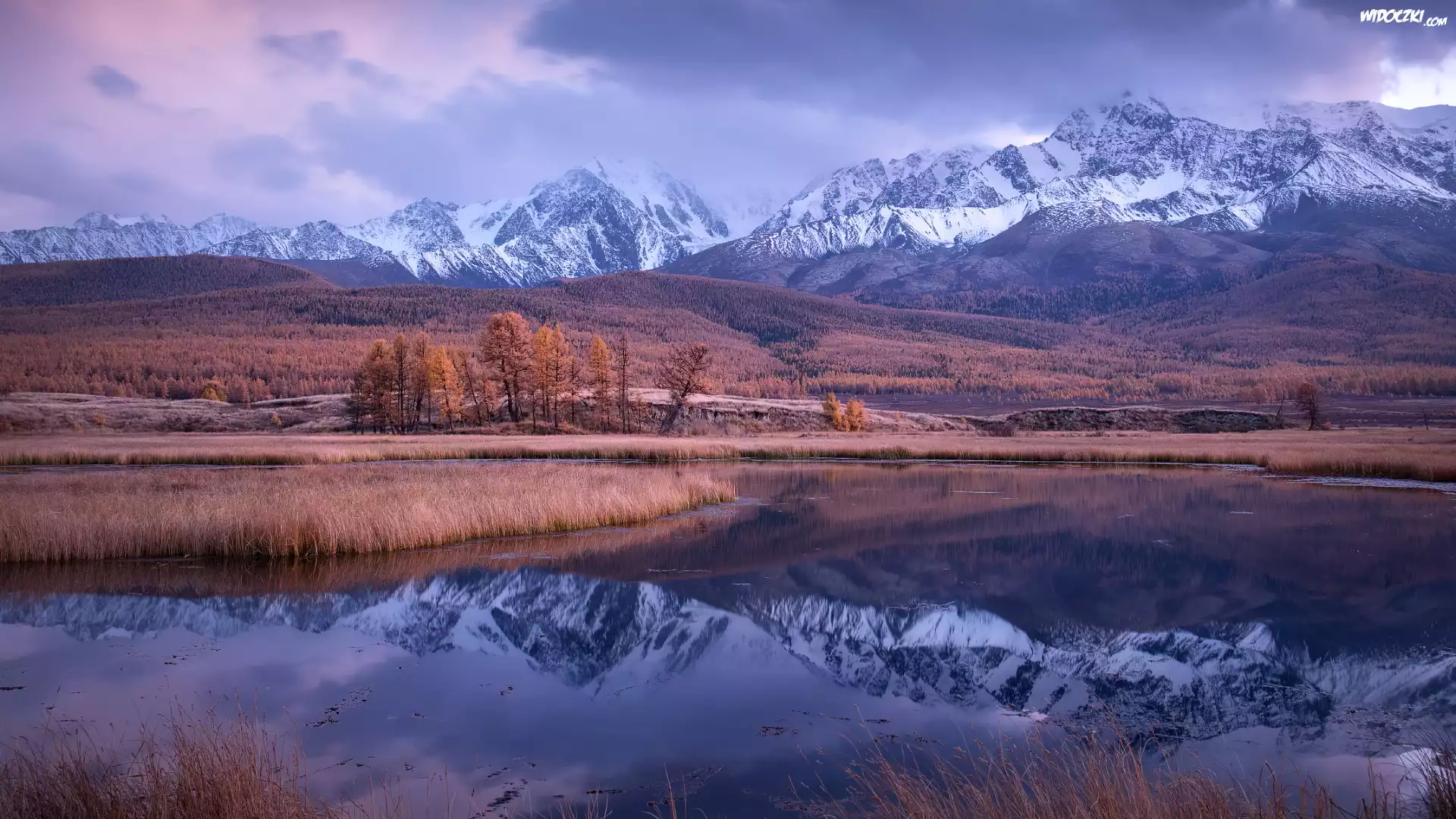 Zdjęcia, Góry Północnoczujskie, Ośnieżone, Szczyty, Drzewa, Jezioro Dzhangyskol, Rosja, Ałtaj