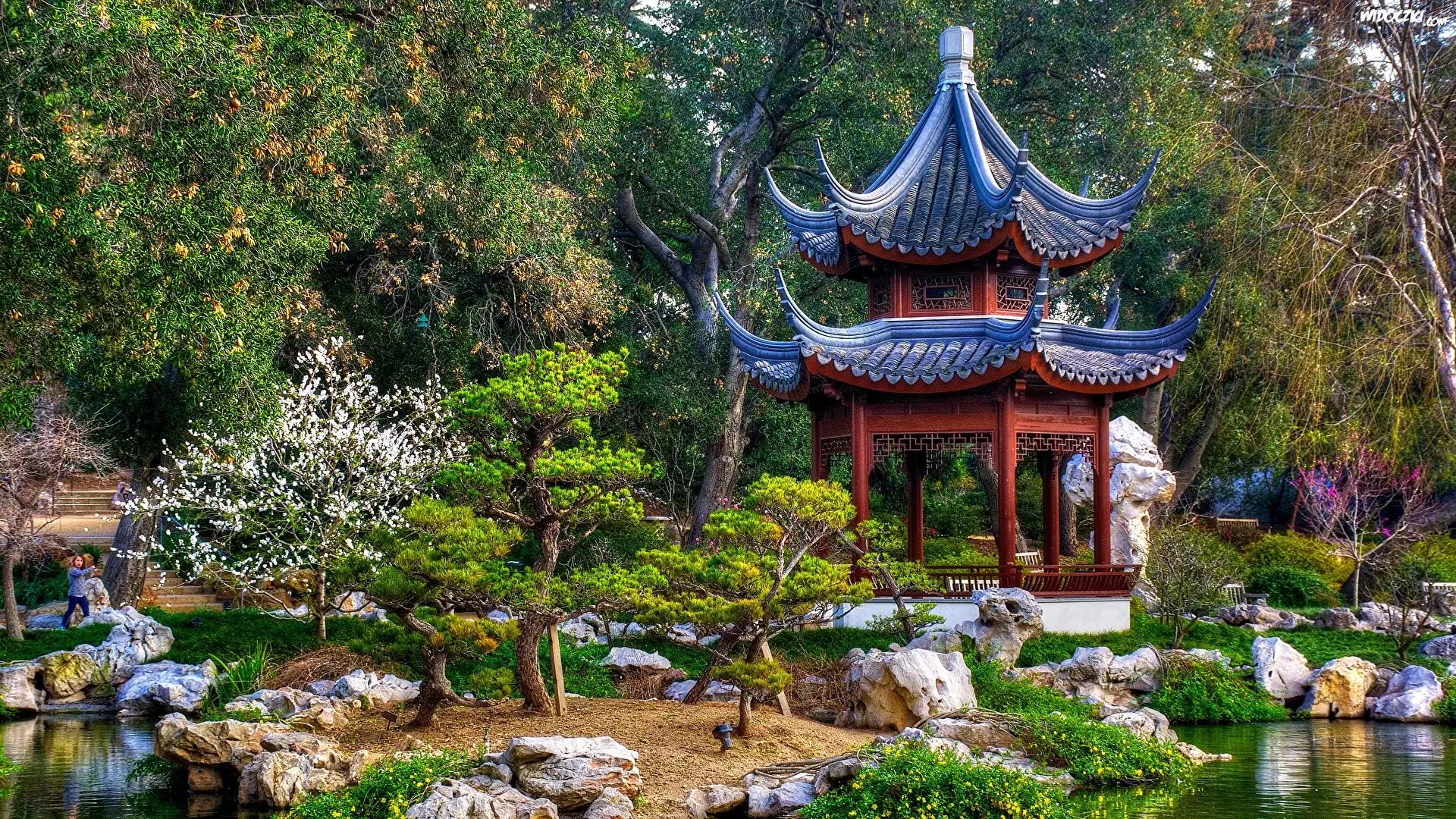 Zdjęcia, Altana, Drzewa, Kamienie, Kwiaty, Japoński, Ogród