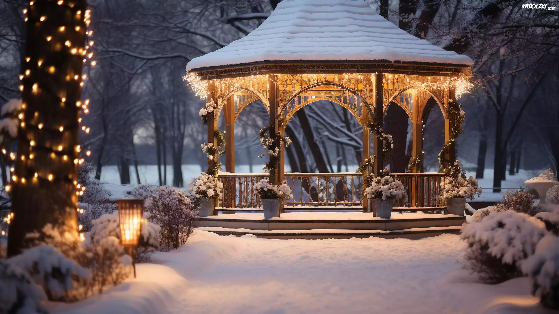 Zdjęcia, Zima, Śnieg, Park, Altana, Drzewa, Krzewy