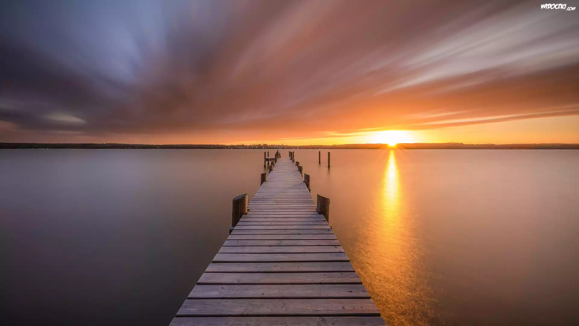 Zdjęcia, Jezioro Ammersee, Pomost, Zachód słońca, Bawaria, Niemcy